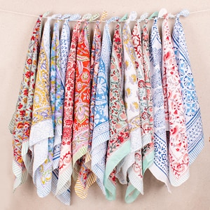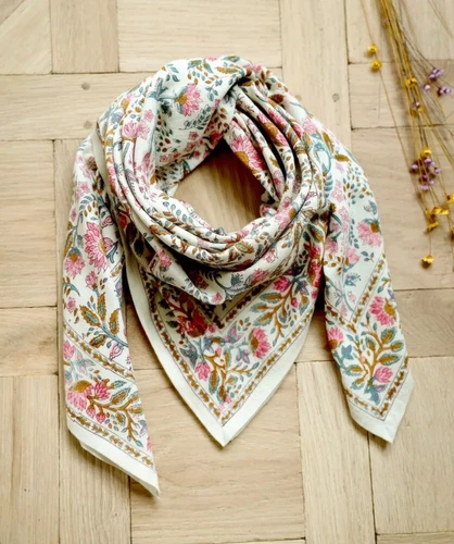 Les bordures fleuries roses encadrent l’ensemble, soulignant l’équilibre entre la richesse du motif et la clarté du fond blanc. Ce procédé purement artisanal confère aux fleurs des nuances irrégulières, révélant une authenticité singulière. MOTIF AUDACIEUX ET ÉQUILIBRÉ : Les fleurs stylisées s’entrelacent avec subtilité, bordées d’une frise florale délicate. IMPRESSION EN BLOCK PRINT : Le dessin floral est apposé à la main selon la méthode traditionnelle du block print. Sur un sac ou en bandana, il devient un détail d’élégance. Foulard indien imprimé avec la méthode artisanale du block print, une technique traditionnelle indienne consistant à imprimer sur le tissu des motifs à l'aide de plusieurs tampons, chacun avec son motif et sa couleur. Foulards de la marque Bonheur du Jour aux designs exclusifs Tissu plumetis de coton blanc fleuri aquarelle rose BIO Maggie Réalisée ton sur ton, cette technique ancestrale confère à chaque écharpe son caractère unique. De subtiles variations de teinte ou d’alignement peuvent apparaître, témoignant du geste de l’artisan et apportant un caractère singulier à chaque modèle. FORMAT PRATIQUE ET ÉLÉGANT : Avec ses dimensions généreuses, ce foulard se porte en bandana, dans les cheveux ou en chèche léger pour s’adapter à tous les looks. COTON INDIEN LÉGER ET RESPIRANT : Tissé dans un voile de coton pur, ce foulard carré de type cheich séduit par son toucher doux. Foulard Artisanal Blanc Fleuri éthique Foulard Imprimé En Voile De Cachemire Effy Blanc Kujten - Femme - AK Foulard Femme Blanc Foulard Coton Indien Block Print - Écharpe d'été - Fleurs de soie ... foulard coton bio, foulard 65 cm, foulard carré, années folles En été ou en hiver, cette écharpe en coton, facile à transporter, se marie avec tous les looks. La technique du block print, minutieuse et ancestrale, consiste à imprimer les dessins à la main à l’aide de tampons de bois sculptés. FROM INDIA BOUTIQUE, la poésie du fait main FROM INDIA BOUTIQUE valorise l’artisanat indien et la richesse des fibres naturelles. Un textile aérien au charme artisanal Issu des ateliers de Jaipur, le foulard carré CHENNAI rend hommage à la légèreté et à la finesse du voile de coton indien. Un foulard carré délicat aux multiples usages De format carré (75 x 75 cm), le foulard en cotonCHENNAI accompagne chaque tenue avec élégance. Sa conception soignée et sa robustesse le rendent facile à emporter et à assortir.