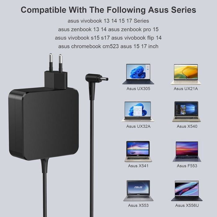 [SMMKOXOI Chargeur pour Asus série Q]: Q200 Q200E Q302 Q302L Q302UA Q303 Q303U Q304 Q304U Q324 Q324U Q405U Q405 Q503 Q503U Q504 Q504U Q505U Q505 Q525U Q525 Q553 Q553U AC Adapter. [SMMKOXOI Compatible avec ASUS Vivobook Chargeur]: Vivobook 14 15 S14 S15 S13 X456 X456U X453 X453S X453M X441 X441N X441S X441U X409 X405 X405U X405UQ X403 X413f X540 X540U E402S E402W E403S E406M X512 X512D X512F X512FA X512J X512JA X510 X510Q X510U X201 X202 X200 X200C X200L X200M X102BA S200 S200E S330UN S430UN X540Y X540UA X540S X540SA X540N X540NA X540L X540LA X540B X541 X541U X541UA X541S X541SA X541N X541NA X542UA X543U X553 X553M X553MA X553S X553SA X556 X556U S510 S510U S510UA S510UQ S510UN S530U. [SMMKOXOI Compatible avec ASUS Zenbook Chargeur]: Compatible avec ASUS Zenbook 13 14 UX360 UX360C UX360CA UX360U UX360UA UX301LA UX301L UX301 UX303 UX303U UX303UB UX303UA UX303L UX303LB UX303LN UX305 UX305C UX305CA UX305F UX305FA UX305L UX305LA UX305U UX305UA UX330 UX330U UX330UA UX330C UX330CA UX330UA UX331UN UX331U UX331 UX410 UX410U UX410UA UX410UQ UX430UQ UX430U UX430 UX430UA UX430UN UX433FA UX461UN UX461UA UX461U UX461; Asus Transformer Book Flip Trio T300L T300LA TP300L TP300LA TP300LD TX201 TX201LA; Asus Taichi 21 Taichi 31 Taichi 21-DH71; Compatible avec Asus Chromebook C200M C200MA C202SA C300M C300MA C300SA C300 C300M C300MA C300S C300SA C301SA C301S C301 D553 D553M D553MA. Accessoire Ordinateur Asus Chargeur 45W ASUS PC Ordinateur Portable DC 19V 2,37A Pour ASUS ZenBook UX303U UX305 UX305F UX305C UX410U, Vivobook Flip 14 15 17 - Informatique Connecteur 4,0x1,35mm Chargeur 45W pour ASUS Ordinateur PC Portable 19V 2.37A (4.0 * 1.35mm)AC Adaptateur ASUS Vivobook Flip 14 15 17 S14 S15 S17 R540L X540S X541N X541U X553M F553M Zenbook 13 UX305F UX305C UX310U UX430U Le 45W Adapter est compatible avec les normes de tension internationales (100-240V, 50-60Hz). Le design compact et portable est facile à transporter avec votre ordinateur portable Asus Vivobook Flip 14 - Alimentation Pour Ordinateur