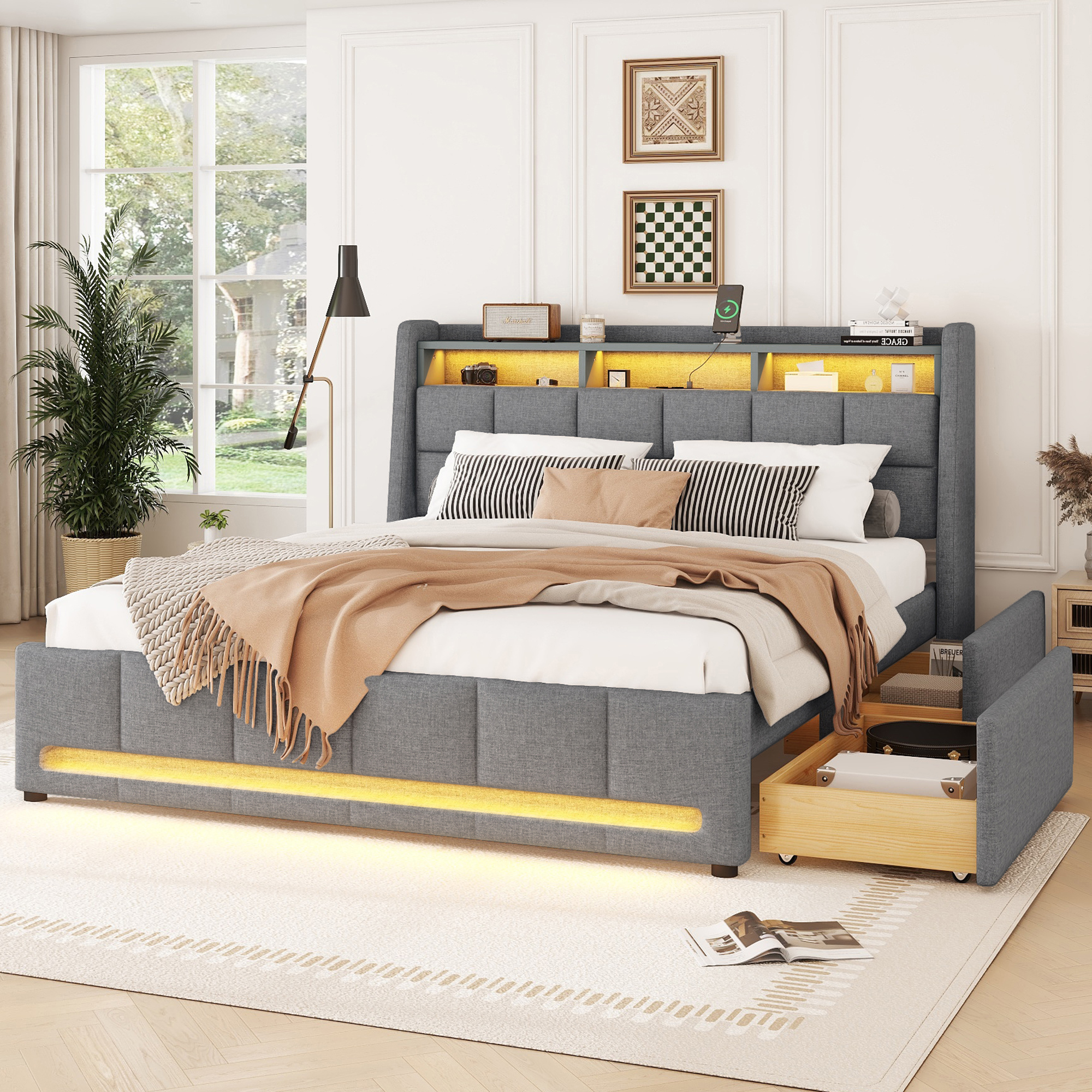 Distance entre la tête de lit : 28 cm. Lit rembourré avec rangement dans la tête de lit, USB intégré et éclairage LED,160*200CM Gris (Sans matelas). Voir les détails du produit. Déposer un avis Tête de lit épaisse et douce pour la peau remplie d'éponge douce. Informations détaillées : pour réduire le risque de dommages, ce cadre de lit est expédié en 2 cartons et ils peuvent arriver à des jours différents. Ce lit avec espace de rangement est fabriqué dans un tissu en velours doux agréable au toucher. 【Tête de lit avec compartiment de rangement et fonction de charge USB】 : la tête de lit est non seulement rembourrée en douceur, mais également équipée d'une prise de courant intégrée et d'un compartiment de rangement qui dispose à la fois d'un port USB intégré et d'un port de type C, ce qui vous permet de charger votre téléphone portable et votre tablette avant de vous coucher. Construction confortable et robuste : le cadre de lit est équipé d'un sommier à lattes, le sommier à lattes est composé de lattes en bois élastiques, le cadre de lit peut supporter une charge allant jusqu'à 300 kg, ce qui assure une utilisation sûre et confortable. Le coffre de rangement hydraulique permet de surélever facilement le matelas pour ranger de grands objets. La tête de lit intègre des compartiments de rangement ouverts (pour tablettes, horloges, vases), un éclairage d'ambiance LED et des ports de charge USB Le grand coffre de lit sous le sommier à lattes vous offre beaucoup d'espace de rangement pour les couvertures, les oreillers ou la literie. Lit Rembourré 160 X 200 - Lit Fonctionnel Hydraulique Avec Rangement Et Eclairage Led Gris 97131268 Lit Velours Beige Sommier à Lattes 300kg Lit 160x200 Avec Sommier – Lit Adulte – Rangement Hydraulique – LED – 1 USB & 1 Type-C – Lit 2 Personnes – Tête Étagère – Lin – - Maison Lit Au Sol 160x200 Matériau : bois + velours + métal Contenu de la livraison : tête de lit + sommier + tiroirs., Charge maximale : 300 kg. Le tissu non tissé noir sur le dessous rend votre rangement plus propre. Détails du produit : Couleur : beige. Matelas adapté (sans matelas) : 140/160 x 200 cm. Dimensions intérieures du tiroir (L x l x H) : 85 x 38,5 x 15,5 cm.
