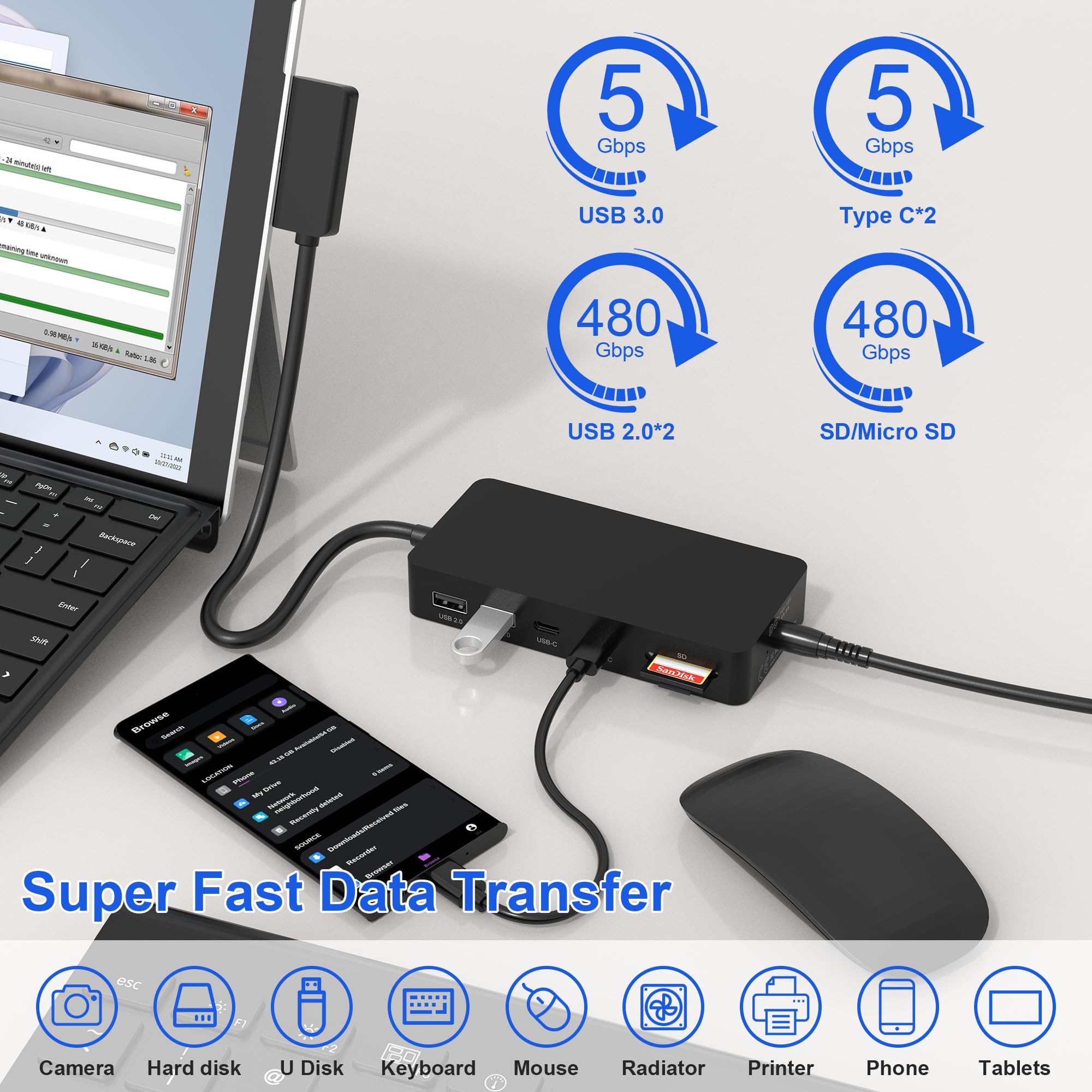 Profitez d'une connexion Internet stable grâce au port RJ45 Gigabit 1000 Mbit/s inclus. Profitez d'une résolution 4K exceptionnelle sur les ports HDMI et multipliez votre efficacité par trois. Microsoft Surface Thunderbolt 4 Dock offre une connectivité complète avec Thunderbolt 4 et un débit de données jusqu'à 40 Gbit/s. La station d'accueil dispose de 3 ports USB-C avec prise en charge USB 4.0 et Thunderbolt 4 pour une flexibilité maximale Optimisez les performances en branchant le câble USB 4/Thunderbolt 4 pour alimenter votre appareil, connectez jusqu’à deux écrans 4K à 60 Hz, et transférez des données et des fichiers jusqu’à 40 Gbit/s, soit quatre fois plus rapidement qu’avec la norme USB 3 Améliorez facilement la vitesse de téléchargement de films et de transfert de fichiers, vous faisant gagner du temps et augmentant votre efficacité au travail. Cable atters Support de Bureau pour Station d'accueil icrosoft Vous pouvez ainsi recharger votre ordinateur portable en toute sécurité tout en connectant plusieurs périphériques pour transférer des données et stocker de l'énergie en toute simplicité. (Remarque : le port de charge TYPC-C ne prend en charge que la fonction de charge. Surface Pro Keyboard Surface Thunderbolt 4 Display Ports Microsoft Surface Dock Triple Displays 2 HDMI+VGA, Surface 12 En 1 Pour Surface Pro 11/10/9/8/ X/7/6/5/4/3, Surface Laptop 7/6/5/4/3/2/1, Surface Laptop Go 3/2/1, Surface Book Connectez facilement divers appareils, tels que des claviers ou des souris. 【Station d'accueil Microsoft Surface Thunderbolt 4 Dock】spécialement conçue pour les appareils Surface, elle offre une gamme d'options de connectivité, notamment un double HDMI prenant en charge la 4K@60 Hz, un port DP la 4K@30Hz, un port VGA la 1080p à 60Hz, un port Ethernet Gigabit RJ45 1000Mbit/s, un port USB-C (chargement et données), 3 ports USB-A 3., 0,un emplacement pour carte SD/TF, une prise casque 3,5 mm et un port 5V CC (alimentation de secours pour la station d'accueil uniquement). Le port VGA prend en charge des résolutions d'affichage allant jusqu'à 1920 x 1080 à 60 Hz.