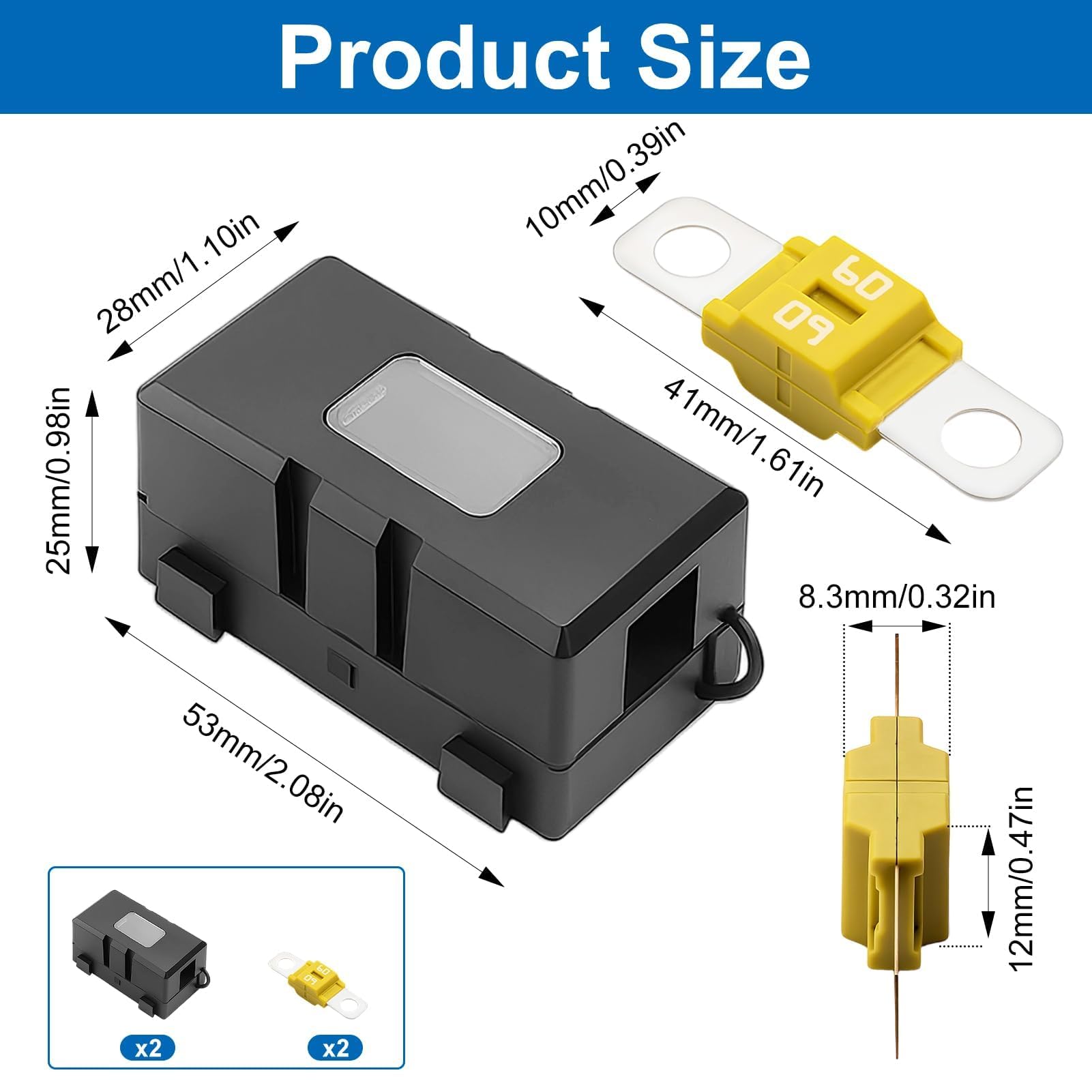 Idéal pour les circuits électriques de voitures, camions, camping-cars, bus ou machines agricoles, il garantit la sécurité de vos équipements en toutes circonstances Porte-fusible ANS : courant nominal applicable 60 A ; protection contre les éclaboussures, ignifuge, circuit. Largement utilisé Nom du produit: Lot de 2 porte-fusible de voiture avec 2 fusibles 60A à vis Couleur: Noir avec bornes métalliques étamées/zinguées Quantité incluse: 2 porte-fusibles + 2 fusibles boulonnés 60A Dimensions et caractéristiques: Courant nominal : 60A Plage de température: -40°C à 85°C Nombre de pièces: 2 pcs porte-fusibles + 2 pcs fusibles haute intensité Matériaux: Porte-fusible en PA66 (polyamide renforcé, isolant thermique et anti-choc) Fusibles avec plastique isolant de qualité supérieure et bornes étamées/zinguées pour conductivité et anticorrosion Utilisation prévue: Idéal pour voitures, camions, bus, camping-cars, véhicules utilitaires, engins agricoles ou industriels. La conception robuste assure un montage stable, réduisant les risques de faux contacts et facilitant l’entretien de vos systèmes électriques Fiabilité garantie: En choisissant ce lot de 2 porte-fusible ANS de voiture et fusibles Midi Boulonnés 60A à Courant Élevé, vous bénéficiez d’une solution durable et sécurisée pour vos circuits électriques Large compatibilité et polyvalence: Conçu pour résister à des températures allant de -40°C à 85°C, ce kit 2 pcs porte-fusible ANS et fusibles Midi Boulonnés à Courant Élevé s’adapte à différents environnements et usages. Avantages du produit: Haute sécurité: fusibles 60A pour protéger efficacement vos circuits. Lot de 2 porte-fusibles ANS pour voiture et 2 fusibles midi à Matériaux résistants et solides: Chaque porte-fusible de voiture ANS et fusibles Midi Boulonnés est fabriqué en PA66, un matériau isolant et anti-chaleur, offrant une excellente résistance aux chocs. Parfait pour les systèmes électriques nécessitant une forte intensité comme batteries auxiliaires, amplificateurs audio, treuils, équipements de camping-car ou autres appareils haute consommation. Chaque pièce a été testée pour garantir une conductivité optimale et une sécurité maximale, même dans des conditions difficiles. Fusibles automobiles, 2 Jeux de Fusible et Porte fusibles, Fusibles... Porte-fusible ANS Midi 60A ANS 3 Porte-fusible De Voiture Et 6 Fusibles Midi Boulonnés à Courant Porte Fusible Pourquoi choisir ce modèle? Avec ce lot de 2 porte-fusible et fusibles 60A courant élevé, vous équipez vos véhicules ou engins d’un système fiable, résistant et conçu pour durer.