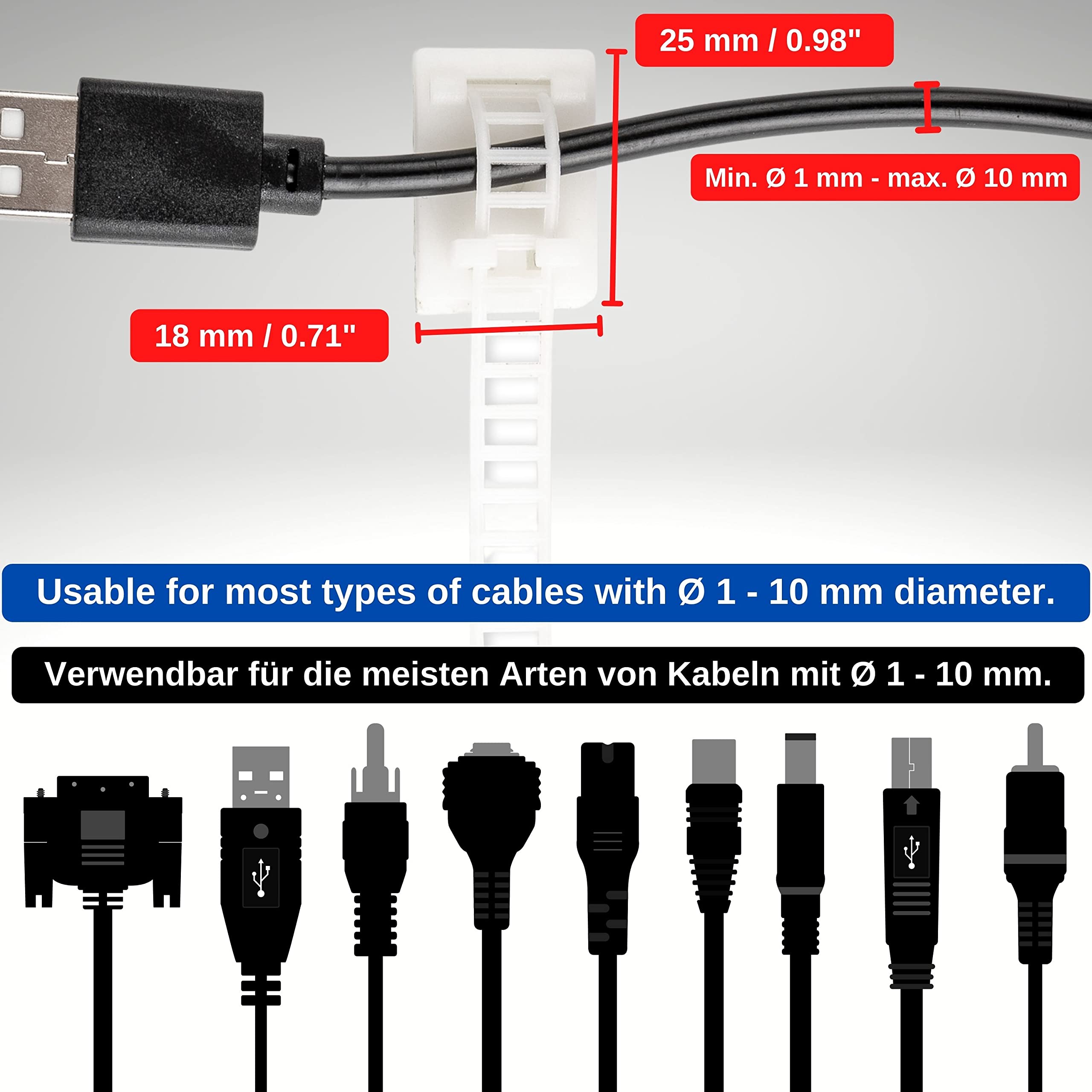 Vos avantages en un coup d'œil : - Pack économique de 25 pour l'organisation - Gestion flexible des câbles - Kit organiseur de câbles avec colle spéciale - Montage possible sur presque toutes les surfaces - Peut également être vissé - Pince murale de câble avec taille optimisée – seulement 25 x 18 mm – discrète - L'organisation des câbles peut être retirée sans laisser de résidus de colle - Chauffez la surface adhésive à l'aide d'un sèche-cheveux - Utilisable pour presque tous les types de câbles – Convient pour un diamètre de câble jusqu'à 10 mm – Utilisable par exemple comme support de câble USB ou support de bande LED Nettoyez la surface adhésive prévue à l'étape 1., La colle spéciale adhère à toutes les surfaces lisses telles que le stratifié, le carrelage, le verre et le bois. Bricolage - Découvrez notre offre Clips De Gestion Des Câbles Autocollants, 25 Pièces, Noir, Câble Jusqu'À 10 Mm, Organisation Cable Pour Tv, Pc, Laptop, La [n1511]. Livraison gratuite à partir de 25€* | Paiement sécurisé | 4x possible | Retour simple et rapide Les clips câbles adhésifs sont conçus pour une gestion efficace des câbles électriques. Fabriqués en plastique de haute qualité, ils offrent une légèreté et une résistance à l'abrasion ainsi qu'à la corrosion ✅ [FINIS LES NŒUDS DE CÂBLES – FIXATION DE CÂBLE POUR MAISON – ATELIER – BUREAU] Votre ordinateur, téléviseur ou robot ménager confère une idée de chaos à vos pièces en raison des nombreux câbles ? Utilisez ces caches câbles pour les organiser 120 PCS GESTION Des Fils Câbles Serre-câbles Autocollants Gestionnaire ✅ [COLLIER DE SERRAGE DISCRET GRÂCE À SA TAILLE OPTIMALE] Ces cavaliers de câble électrique sont idéaux en tant que câble management. ✅ [CONTENU DU COLIS] 25 x clips pour câbles à coller, sans percer, en plastique noir Organisation Câbles Kit De Gestion De Câbles 188 Pièces - Gaines Flexibles - Attache-Câbles Lot Clips Câbles Ensuite, vous devez donner à la colle spéciale du support de câble de bureau vingt-quatre heures pour durcir. Lot de 25 clips de gestion de câbles auto-adhésifs - 25 x 18 mm - Noir - Jusqu'à Ø 10 mm - Peut également être vissé - Organisation des câbles Le câble de charge de votre téléphone portable, le câble de données de votre PC domestique ainsi que les câbles de téléphone de votre routeur volent en croix et en croix dans l'appartement ? Ici, vous avez trouvé la solution – à l'aide de cet organisateur de gestion des câbles, collez vos câbles à l'endroit approprié et cela sans perçage ni vissage. Le montage de votre nouvelle gestion de câbles pratique est très simple., .