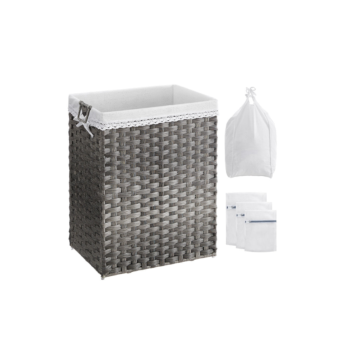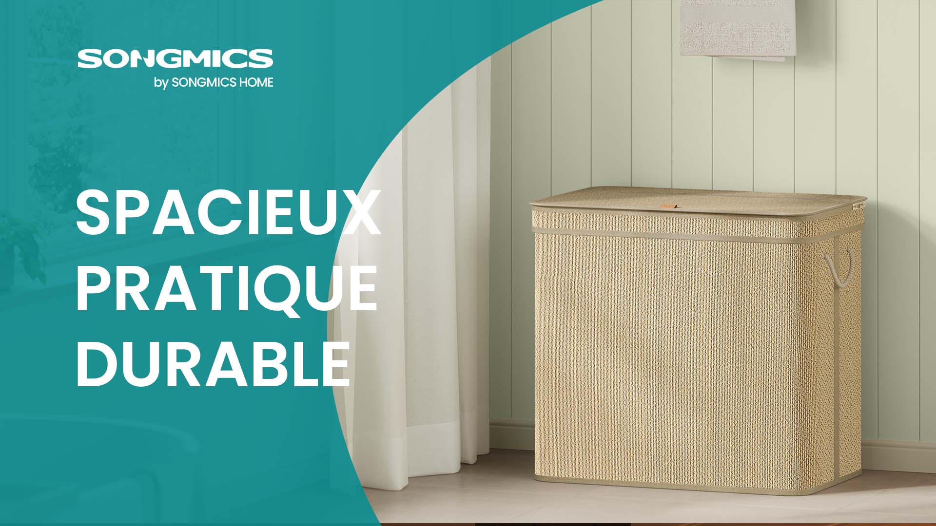 [Lavable et respirant, utilisation pratique et hygiénique] Fabriqué à partir d'un tissu mélangé de coton et de polyester, le sac est lavable en machine pour plus de propreté et moins d’odeur désagréable de vêtements sales SONGMICS Panier à Linge avec Couvercle à 3 Compartiments, 150L, Sac SONGMICS Panier de Rangement, Corbeille Linge Sale 90L avec Couvercle, Pliable, Sac en Tissu Amovibles et Poignées, pour Couvertures, Vêtements [Pliable et facile à assembler] Grâce à sa structure pliable, il suffit de déplier le cadre, d'insérer le fond et d’attacher le sac. N'hésitez pas à le remplir à ras bord avec tout votre linge sale Panier à linge, compact : Vous avez besoin d'un bac à linge sale pour les petits espaces ? Le voici ! Avec sa taille de 46 x 33 x 60 cm, ce panier à linge de 90L avec poignées prend peu de place au sol mais peut accueillir beaucoup de vêtements 3 étapes, 0 outil de montage, 0 effort ! [Matériaux sélectionnés, grande robustesse] Le sac en tissu de 200 g/m² est résistant et supporte jusqu'à 20 kg, avec un panier en métal, l’ensemble supporte jusqu’à 30 kg. Panier Lavable Machine SONGICS Panier à Linge 100L, Corbeille Linge Sale 2 Copartients, Couvercle En Babou Organisation Buanderie