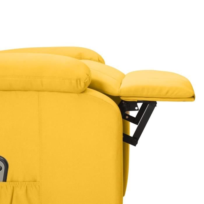 De plus, la télécommande incluse vous permet de choisir différents programmes de massage. Foteuil Salon Fauteuil De Salon VidaXL Fauteuil Inclinable Le fauteuil « vidaXL Fauteuil de Massage Inclinable » pourrait bien être la solution que vous attendiez. Offrant confort et modernité avec son design en tissu gris foncé, ce fauteuil vous promet relaxation et bien-être grâce à ses fonctions d’inclinaison et de massage Profondeur du siège : 58,5 cm 【Fonction d'inclinaison manuelle :】 ce fauteuil inclinable est doté d'une poignée du côté droit. Hauteur des accoudoirs à partir du sol : 59 cm Largeur du siège : 47 cm 【Poche latérale pratique :】 ce fauteuil est doté d'une poche latérale pour ranger votre télécommande ou garder vos objets essentiels à portée de main. Matériau de remplissage : mousse, fibre de polypropylène Fauteuil De Massage Fauteuil Inclinable - SHIPENOPHY - M1778 - Jaune - Tissu - Dossier Et Repose-pied Réglables Fauteuil Salon Massage Vibrations Type de massage : massage par vibrations par 6 points Asseyez-vous et détendez-vous dans ce fauteuil inclinable de massage très confortable ! Fonction d'inclinaison manuelle : ce fauteuil inclinable est doté d'une poignée du côté droit. Vous pouvez régler manuellement le repose-pieds et le dossier dans n'importe quelle position selon votre confort en tirant simplement sur la poignée. Cette fonction permet une inclinaison maximale de 135... Capacité de charge maximale : 110 kg, Assemblage requis : oui 【Expérience d'assise confortable :】 le siège, le dossier et les larges accoudoirs bien rembourrés recouverts de tissu procurent une sensation confortable et chaleureuse, vous permettant de vous sentir enveloppé lorsque vous êtes assis. Dimensions de couchage : 70 x 146,5 x 83,5 cm (l x P x H) Courant d'entrée : 2A La fonction de massage est alimentée par le connecteur USB, mais la source d'alimentation USB 5V certifiée n'est pas incluse. De plus, le dossier peut revenir rapidement à sa position d'origine en tirant simplement sur la poignée. Asseyez-vous et détendez-vous dans ce fauteuil inclinable de massage très confortable ! Dimensions d'assise : 70 x 93 x 101 cm (l x P x H)