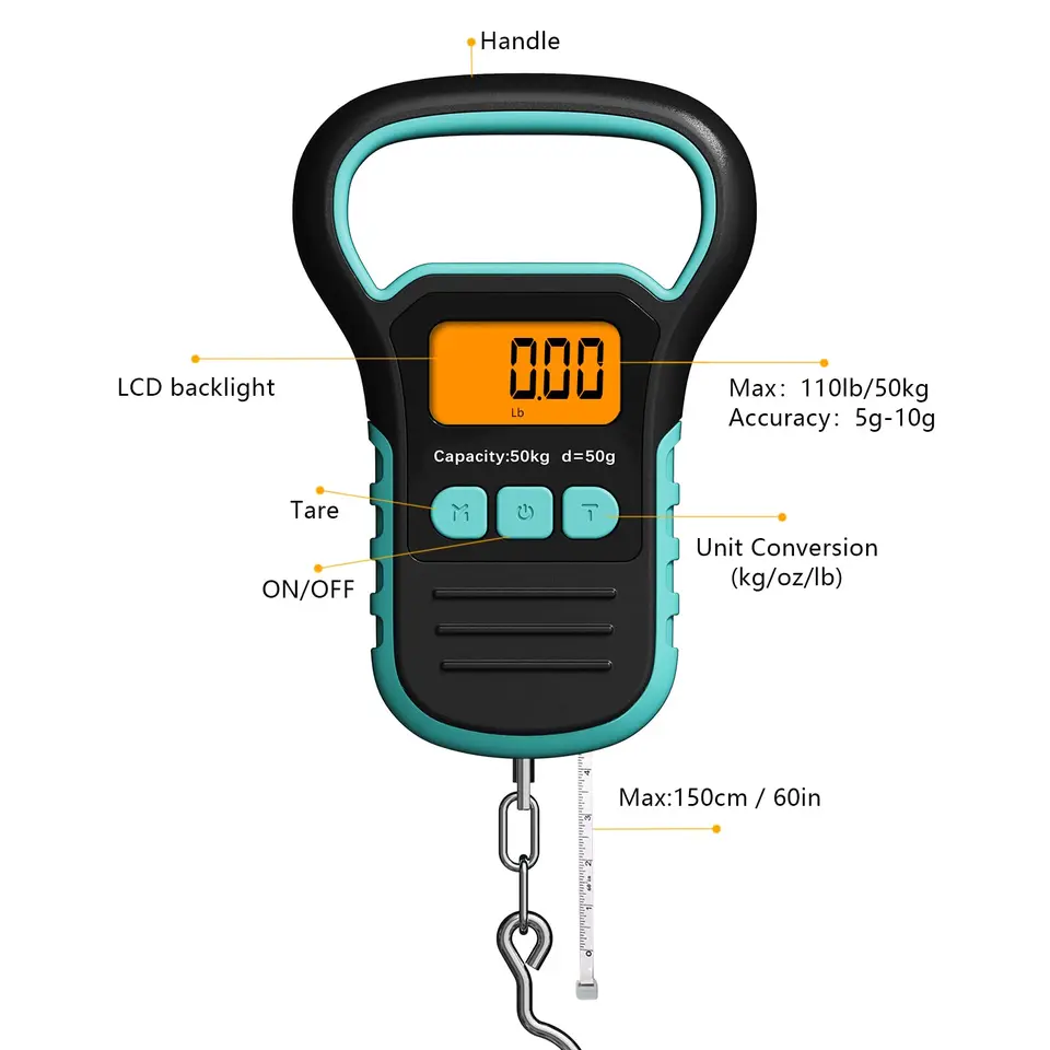 Shipenophy Balance numérique Balance de poids numérique LCD Balance Crochet ORIA Balance De Pêche Numérique, 50kg/10g Balance Electronique Avec Ruban à Mesurer, Balance à Bagages Avec Écran LCD Rétroéclairé, Grande Poignée, Batterie Incluse - Vert Pese Bagages De Voyage Pince de Pêche Flottante: La balance de valise est équipée d'une pince à poisson à lèvre, conçue pour aider à mesurer le poids sans blesser le poisson. Mesure Précise: La balance de pêche numérique est dotée de capteurs de haute précision qui mesurent facilement divers articles pesant entre 15 g et 50 kg. L'écran LCD avec rétroéclairage orange garantit une visibilité claire des lectures, même dans des conditions de faible luminosité Balance de Pêche Numérique, ORIA 110lb/50kg Balance de Bagage Electronique avec Règle, Fishing Postal Crochet de Suspension avec Ruban à Mesurer, Ecran LCD Rétroéclairé (Piles Incluses) - Orange Fonctions Multiples: Le kit de balance de pêche offre une gamme de fonctions, notamment le verrouillage rapide des données, la mémoire de l'unité, l'arrêt automatique après 180 secondes d'inactivité, l'indicateur de batterie faible et l'indication de surcharge. Jusqu'à 50kg de capacité avec une précision de 10g. Ecran LCD rétroéclairé orange pour voir même en plein soleil. Poignée large et antidérapante pour une bonne prise en main. Le petit plus ? Un mètre ruban intégré (38 pouces) pour mesurer tes prises. Fonctions pratiques : verrouillage du poids, arrêt auto, indicateur de batterie Mètre Ruban Intégré: En plus de peser, la balance suspendue comprend un mètre ruban extensible intégré (38 pouces de long), vous permettant de mesurer la longueur des prises, de vérifier les dimensions des bagages, de mesurer la longueur des colis, etc. Qu'il s'agisse de petits articles ou de charges plus lourdes, elle fournit des lectures précises jusqu'à 0,005kg pour les articles de moins de 10 kg et 0,01kg pour ceux de plus de 10kg