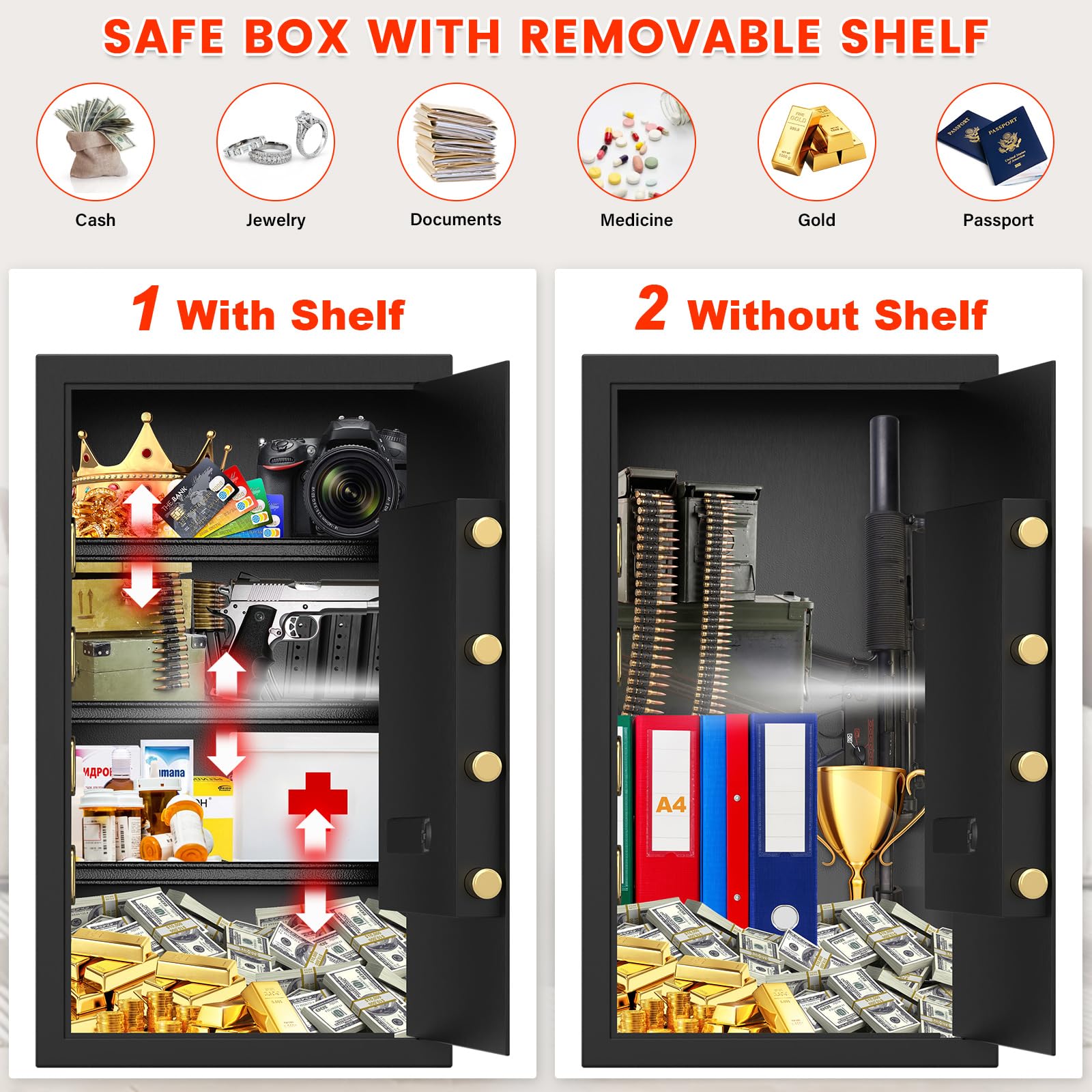 Les trous pré-percés et le matériel de montage inclus rendent l'installation un jeu d'enfant, que vous souhaitiez le visser au mur ou le monter. Chaque serrure a un numéro de série unique, de sorte que vous pouvez facilement demander une clé de rechange si nécessaire. Étagères amovibles pour un rangement flexible : le grand coffre-fort ménager dispose d'étagères amovibles dans lesquelles vous pouvez ajuster l'intérieur pour accueillir des objets de toutes tailles, de l'argent liquide et des bijoux aux armes et aux drogues. Chaque serrure a un numéro de série unique pour remplacer la clé en cas de perte. Ce coffre spacieux pour la maison offre suffisamment d'espace de rangement pour vos objets de valeur, y compris les bijoux, l'argent liquide, les documents importants et même les armes, pour s'assurer que tout est stocké en toute sécurité en un seul endroit Avis clients · Facilité d'utilisation (4,3/5) · Rapport qualité / prix (4,4/5) · Performance (4,4/5) · Simplicité d'entretien (4,5/5 Coffre Fort Coffre-fort Ignifuge 48L Avec Porte-documents A4 Remarque : ne placez pas de clés de rechange dans le coffre-fort Si vous avez des questions, vous pouvez nous consulter à tout moment et nous vous offrons un service en ligne 24 heures sur 24 Avec des lumières LED intégrées, vous pouvez rapidement accéder à votre coffre-fort personnel dans l'obscurité depuis votre coffre-fort personnel Offrez la protection la plus puissante pour la sécurité de vos biens Coffre Fort Ignifuge Et Etanche Grand Coffre-fort Ignifuge De 45 L Avec Porte-documents Sac Ignifuge A4 Inclus Design anti-vol et anti-vol : le coffre-fort numérique de sécurité antivol avancé comprend une porte en acier solide renforcée de 78 mm, des boulons de verrouillage épais de 30 mm à triple noyau solide et deux charnières anti-impact, offrant une protection fiable pour vos objets de valeur Combinaison d'un coffre-fort numérique et d'un porte-documents ignifuge : 45 l grand sac étanche ignifuge est la solution ultime pour protéger les objets de valeur et les documents importants. Ce coffre-fort de sécurité numérique offre plusieurs possibilités d'accès, y compris une serrure à combinaison électronique, une clé de rechange et un boîtier de batterie externe pour éviter les blocages dus à des piles déchargées. Le sac étanche au feu A4 fourni offre une sécurité supplémentaire pour protéger vos affaires contre les dommages causés par le feu et l'eau. Description du produit : Le coffre-fort de 45 l avec sac étanche ignifuge est la solution ultime pour sécuriser vos objets de valeur et documents importants. Ce coffre-fort est idéal pour les familles, les hommes d'affaires et tous ceux qui veulent protéger leurs objets de valeur, et est un must pour sécuriser vos objets les plus importants. Son design moderne et discret s'intègre parfaitement dans un environnement sûr et élégant dans les environnements de maison ou de bureau.