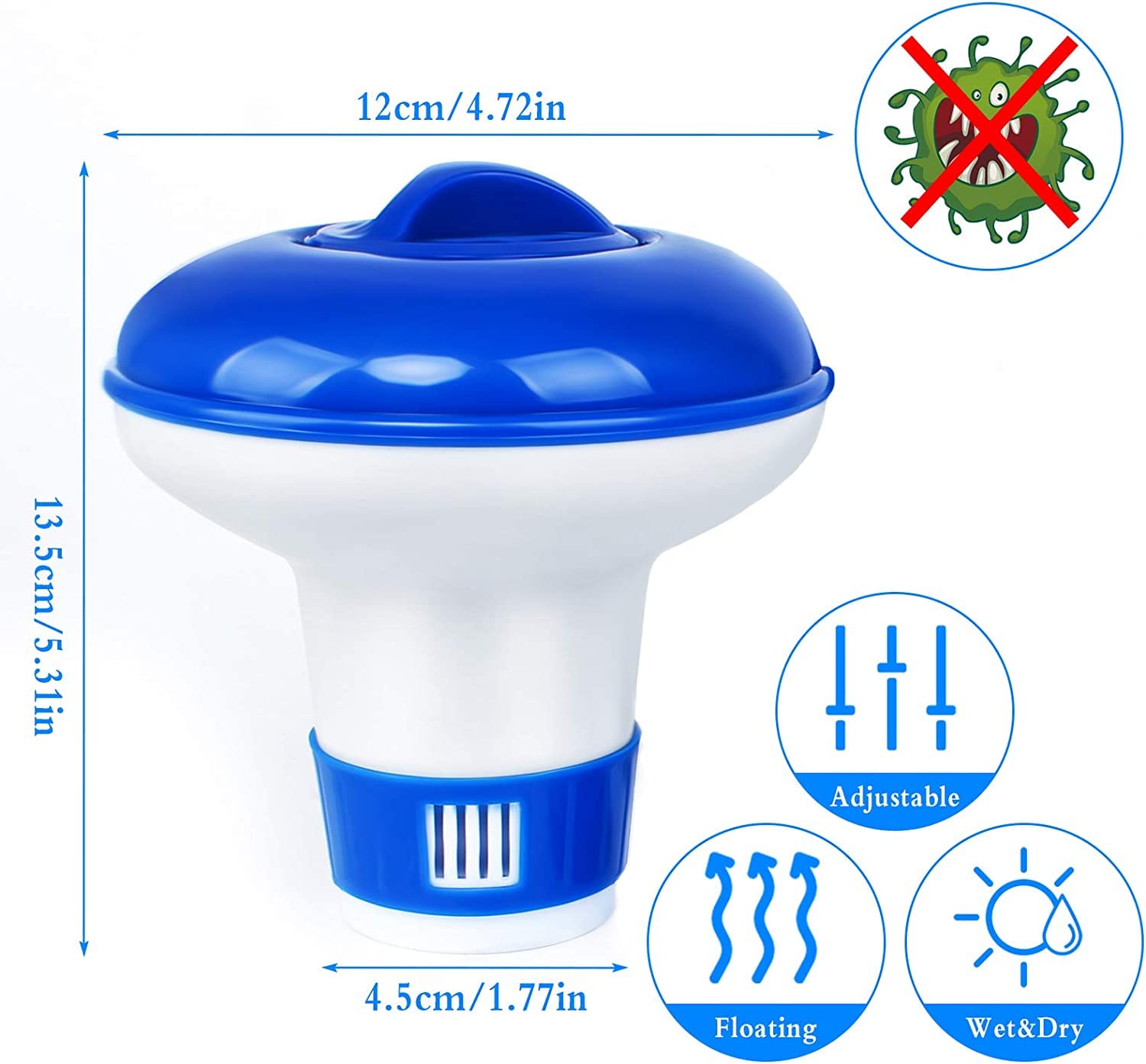 Flotteur de Chlore re de Piscine de qualité supérieure226 Flotteur Tablette 3 Pouces Cclear Pool Supply Pool Flotteur De Chlore Pour Tablettes De Chlore De 76 Cm Durable Distributeur De Chlore Flottant Flotteur De Chlore Support Chimique Flotteur Piscine Extérieure Fonctionnalité réglable : obtenez des performances optimales avec notre distributeur réglable qui peut être réglé pour répondre à des demandes uniques de débit de décharge, gardant votre piscine ou spa parfaitement équilibré. Fabriqué avec des matériaux résistants à l'érosion, il est parfait pour répondre à différents besoins et prolongera la durée de vie de l'équipement de votre piscine ou de votre spa. Caractéristiques:Matériel:ABSTaille du produit:A : Cinq pouces (avec clip)Taille: 12x11,5 cm/4,72x4,52 poucesDiamètre: 4,5 cm/1,77 poucesPoids net : 74gB : sept poucesTaille: 17,5x15,5 cm/6,88x6,1 poucesDiamètre: 8,5 cm/3,35 poucesPoids net : 166gC : Neuf poucesTaille: 22x19,8 cm/8,66x7,80 poucesDiamètre: 9 cm/3,54 poucesPoids net : 260gListe de colisage:1 * flotteur de chlore de piscineNote:En raison des différents paramètres d'éclairage et d'écran, la couleur de l'article peut être légèrement différente de celle de l'image. Ce distributeur vous permettra de stocker jusqu’à 4 kilos de pastilles de chlore. Pour remplir votre diffuseur, nous vous recommandons d’opter pour du chlore lent, comme le Chlore multiactions 6 actions En raison des différentes mesures manuelles, veuillez prévoir une différence de taille de 1 à 2 cm. Grand espace de stockage : gardez votre piscine propre sans effort grâce au distributeur facile à utiliser du Pool Tablet Floater qui peut contenir plusieurs tablettes de 1 ou 3 pouces, réduisant ainsi le besoin de remplissage constant et permettant plus de temps pour profiter d'une piscine cristalline Grand espace de stockage : gardez votre piscine propre sans effort grâce au distributeur facile à utiliser du Pool Tablet Floater qui peut contenir plusieurs tablettes de 1 ou 3 pouces, réduisant ainsi le besoin de remplissage constant et permettant plus de temps pour profiter d'une piscine cristalline., . Pratique et facile à utiliser, ce flotteur est un incontournable pour tout propriétaire de piscine ou de spa.