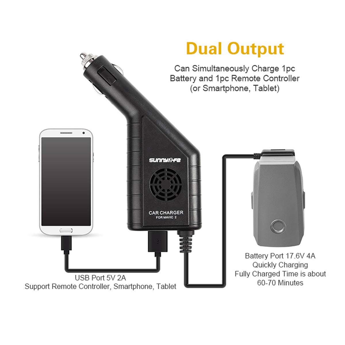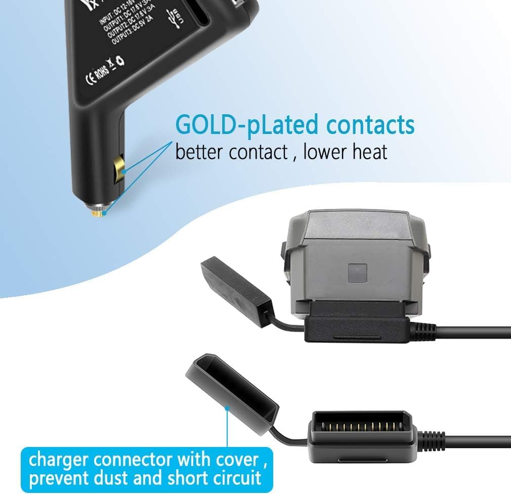 3 en 1 voiture chargeur avec USB pour Mavic 2, peuvent charger simultanément 1 batterie et 1 contrôleur distant (ou smartphone, tablette) Compatible avec DJI 2 Mavic Pro/zoom FPV drone Caractéristiques techniques : – Input : 12–16 V DC – Batterie de sortie : 17,6 V DC 4 a – Sortie USB : 5 V 2 A Yangers Chargeur de Voiture pour DJI Mavic 2 Zoom/Pro, Adaptateur de Chargeur de Voiture 3 en 1 pour Deux Batteries DJI Mavic 2 Zoom/Pro + 1 télécommande (Noir Liste d'emballage : 1 x chargeur de voiture Que ce soit à la maison, en voiture ou en voyage : avec ce CHARGEUR USB DE VOITURE 2-EN-1 et ses deux prises de connexion USB, vous disposez de la bonne connexion pour charger partout et où vous le souhaitez un smartphone, une tablette et d'autres petits appareils. Un outil très pratique Chargeur 2 En 1 Drone Voiture JXE Cargador De Coche 2 En 1 Mando A Distancia Tablet Smartphone Cargador De Batería Con Puerto USB Para Dji Mavic 2 Pro/Zoom Quadcopter Chargeur USB Télécommande Chargeur de batterie pour manette de jeu Nintendo Wii, télécommande S6...
