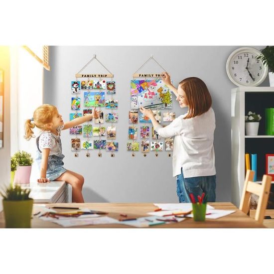 CADRE PHOTOS PÊLE-MÊLE 24 photos Galerie cadre mural 10x15 collage DIY Tableau Photo Porte Photo Mural Filet Décoratif, Cadre Photo Pêle Mêle Diy Décoration Cadre Photo Personnalisé Il est facile à installer et peut être réutilisé, ce qui permet de basculer facilement entre différents thèmes d'affichage. COMPLETEMENT ÉQUIPÉ: 60 pinces en bois avec force de serrage modérée qui ne endommagent pas les photos ou les cartes postales, adaptées aux expositions en papier de différentes tailles. STYLE VERSATILE: La conception du panneau suspendu est simple et polyvalente et peut être associée à des photos, des illustrations, etc. Cadre-Photos mural Pêle-mêle ESTINK -UNE - Maison Pour décorer les murs du salon, de la chambre et de l'étude. Faciles à poser et disponibles à l'achat en magasin, ces cadres sont un moyen pratique et design de mettre ses photos en avant tout en apportant à son intérieur... ADAPTATION MULTI SITE: Convient pour la décoration murale de la maison, la rénovation de la location, la mise en page du studio et peut également être utilisée pour créer une atmosphère festive (comme les anniversaires et noël). Que ce soit des polaroïdes de petite taille ou des photos régulières, ils peuvent être serrés fermement pour répondre aux besoins d'affichage d'un grand nombre d'éléments.