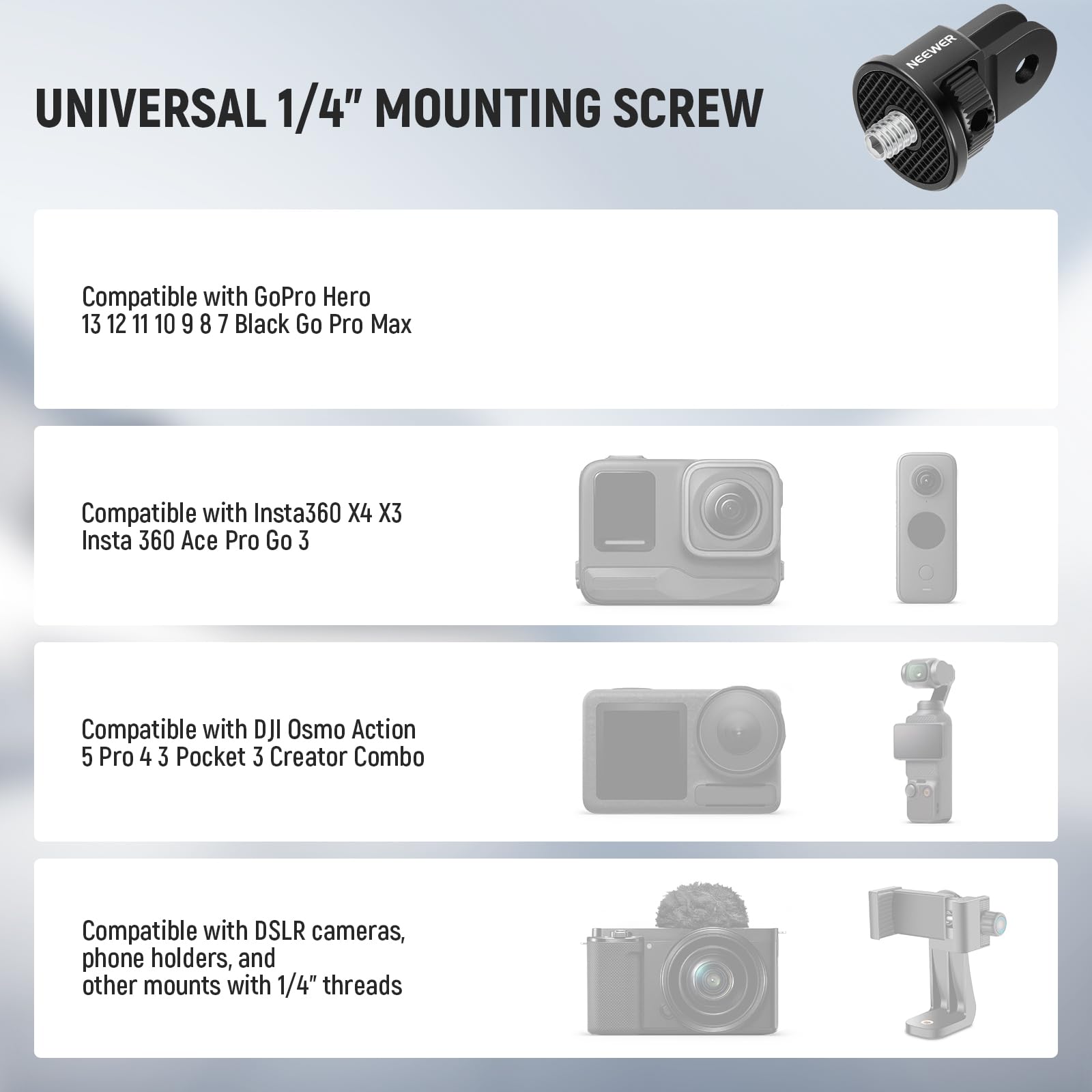 Ne convient pas à une utilisation dynamique (voitures, motos, etc., ). Le trou de positionnement améliore la stabilité. Pour Osmo 360 Action 5 Pro/4/3] Compatible avec DJI Osmo 360 Action 5 Pro, 5 Pro Adventure Combo, Action 4 et Action 3, ce support adaptateur magnétique à dégagement rapide avec une rotule à 360° peut instantanément et en toute sécurité fixer votre caméra d'action pour des prises de vue POV 【Tête sphérique rotative à 360°】 Le support à rotule à 360° permet un réglage flexible de l'angle de la caméra et vous permet de capturer des séquences à partir de n'importe quelle perspective souhaitée Idéal pour les créateurs de contenu, accessoires essentiels pour caméra d'action et influenceur indispensable pour la photographie NEEWER Support de sangle de tête pour caméra d'action, support magnétique à dégagement rapide pour Charge maximale : 1lb/500g. 1 Base magnétique amovible 2 Filetage 1/4 3 Léger et portable Filetage 1/4 Pouce Perche Selfie NEEWER Adaptateur De Montage Pour Caméra D'action Compatible Avec Les Accessoires GoPro Go Pro DJI Insta360 AKASO, Support En Métal à Filetage 6,35 Mm Pour Mini Trépied Selfie, Inclinaison à 180°, GP Base Amovible Rotule 360