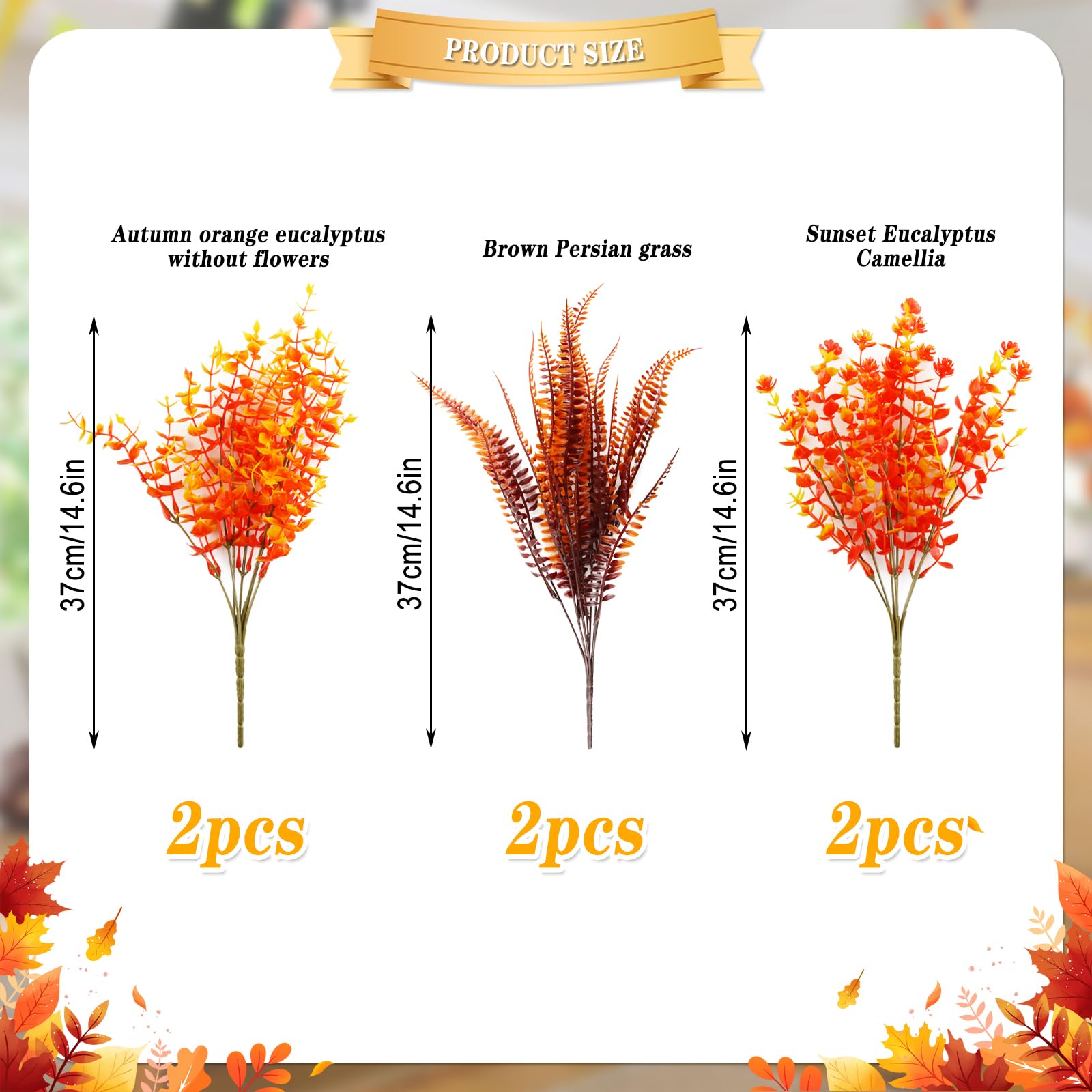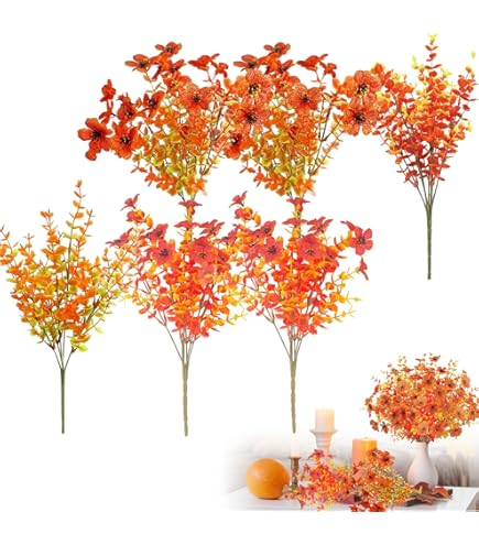 Caractéristiques : - 💐💐Vous recevrez 6 charmants bouquets fleur artificielle automne, l'ensemble contient 2 * camélia d'eucalyptus coucher de soleil + 2 * fleurs d'eucalyptus orange d'automne + 2 * herbe persane brune. Faux Bouquet De Fleur Ceenna Lot De 16 Fleurs D'automne Artificielles Assorties Avec Tiges De Feuilles D'eucalyptus Oranges Artificielles En Plastique Pour Thanksgiving, Récolte, Jardin, Porche (eucalyptus, 38,1 Cm Fleurs Artificielles Automne Eucalyptus - 🍁🍁Ceux-ci fleurs artificielles automne sont fabriqués avec des matériaux durables et résistants aux UV, parfaits pour les balcons, les jardins et les espaces de vie. Créez facilement une forte ambiance automnale., 2., 🍂🍂【Match d'automne】Nous lançons 6 bouquets bouquets de fleurs artificielles aux couleurs naturelles pour créer la décoration d'automne parfaite. Choisissez la haute qualité bouquets de fleurs artificielles pour une option décorative durable pour votre maison., 5., 🌷🌷【Décoration parfaite】Fleurs artificielles décoration est la décoration parfaite pour l'automne et Thanksgiving, bouquet automne convient aux vases de décoration de la maison, aux pots de fleurs, aux chambres, aux salons, aux jardins, aux tables à manger, aux balcons et à d'autres scènes. Bouquet de Lavande Artificielle - Le jardin artificiel Laissez-vous profiter pleinement de l'automne. Créez une ambiance automnale chaleureuse avec ces produits de haute qualité bouquet d'automne artificiel sans les tracas d'entretien. Parmi elles, les branches d’herbe persane peuvent être ajustées à volonté., 4., 🌻🌻【Facile à entretenir】Fleurs artificielles d'automne aucun entretien requis à tout moment, résistant aux intempéries, ne se décolore pas, beau et durable, gardant frais et charmant toute l'année. Nous vous répondrons dans les 24 heures., 1., 🍁🍁【Atmosphère d'automne】Bouquets de fleurs artificielles les couleurs automnales orange et marron ajoutent une atmosphère chaleureuse et invitante à l'automne. Fleur artificielle automne est un incontournable pour tous les amoureux de l'automne ! Chaque bouquet fleurs artificielles décoration mesure environ 37 cm de long et présente des branches d'automne réalistes avec des feuilles et des fleurs lumineuses. Lot de 4 paquets de fleurs d'automne artificielles - Décoration d'automne - Feuilles d'érable - Simulation d'automne en plastique - Bouquet d'automne | Leroy Merlin