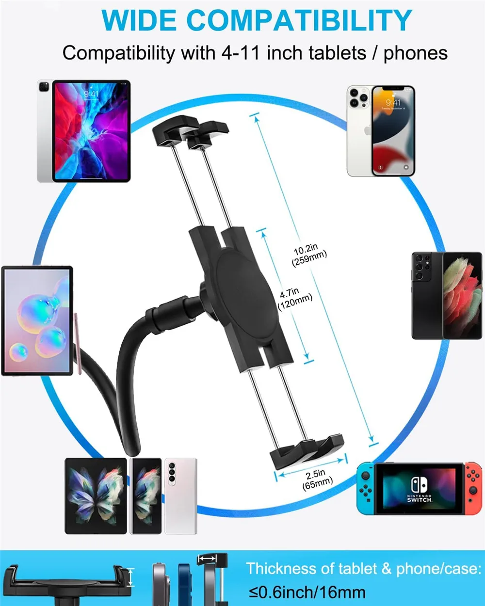 Son design noir sobre et élégant s'intègre parfaitement dans les bureaux, les salons ou les cafés. Le support pour tablette se fond discrètement dans le décor, créant un environnement épuré et esthétique. Des tests approfondis en laboratoire ont démontré sa capacité de charge de 1 kg, permettant de maintenir en toute sécurité même un iPad Pro 12,9 pouces avec sa coque de protection. Découvrez notre offre Support tablette réglable pas cher : large sélection de produits au meilleur prix | Livraison gratuite à partir de 10€* | Entreprise française | Paiement 4x possible Sa surface noire est résistante aux rayures et aux traces de doigts. Que ce soit pour regarder des séries sur votre tablette ou pour passer des appels vidéo avec votre smartphone, ce support offre un maintien fiable. Spécifications : Matériau : Acier au carbone Couleur : Noir Poids : 580 g Dimensions : 28 x 22 x 4 cm Contenu de l'emballage : 1 x Support de tablette Trouvez des supports réglables et robustes pour tablettes et iPad pour une utilisation mains libres. Parfait pour le travail, le streaming ou la navigation, où que vous soyez Stabilité optimale et réglages flexibles Ce support est doté de trois articulations flexibles, vous permettant de trouver facilement l’angle de vision idéal. Que ce soit sur votre bureau, votre table de chevet ou votre plan de travail, il s'intègre harmonieusement à son environnement, créant un espace propre et esthétique. Support pour tablette pratique et réglable : Ce support s'intègre parfaitement à tous les modes de vie : au bureau, il transforme votre smartphone en second écran, vous permettant de consulter vos messages tout en travaillant ; dans la cuisine, il maintient votre tablette en toute sécurité, protégeant ainsi vos recettes des éclaboussures de graisse ; dans la chambre, il s'ajuste de façon optimale pour un confort maximal lors de vos séances de visionnage au lit ; et lors des visioconférences, il offre une base stable à votre appareil, pour une présentation professionnelle. Toutes les articulations bénéficient d'une finition lisse, garantissant un réglage en douceur et un positionnement précis. La base avec son système de fixation assure un maintien sûr, même sur les surfaces lisses. Compatible avec de nombreux appareils : Ce support tablette lit répond aux exigences d'un support multifonctionnel, offrant une stabilité optimale pour les appareils allant de l'iPhone SE 4,7 pouces à l'iPad Pro 12,9 pouces. Fini les glissements et les basculements : utilisez votre appareil en toute sérénité. Support Kindle Pour Lit Avec Télécommande TRYONE Pince Pour Tablette Jusqu'à 28 Cm De Largeur Compatible Avec IPad Pro Air Mini, Galaxy Tabs, Kindle Fire, Switch Ou Autres Appareils De 4,7 à Support de tablette noir sobre Avec sa couleur discrète et ses lignes épurées, il se passe de fioritures inutiles. Support pour tablette FuxFuis – Compatible avec les smartphones de 4,7 pouces à 12,9 pouces. Grâce à sa conception pliable, il se range facilement. Ce support pour tablette facilite le passage du mode portrait au mode paysage et s'adapte à vos besoins, que vous soyez debout, assis ou allongé. Porte Tablette SAIJI Support Tablette Pour Lit, Support De IPad Ergonomique Amélioré, Support De Moniteur Portable Pour Lit Adapté Aux Téléphones, Tablettes, Switch Et Autres Appareils De 4,7-17,3 Support Telephone Lit Plus besoin de supports séparés pour vos différents appareils. Ces détails rendent ce support particulièrement pratique au quotidien. Que vous regardiez des vidéos au lit ou cuisiniez dans la cuisine, vous trouverez toujours l'angle parfait.