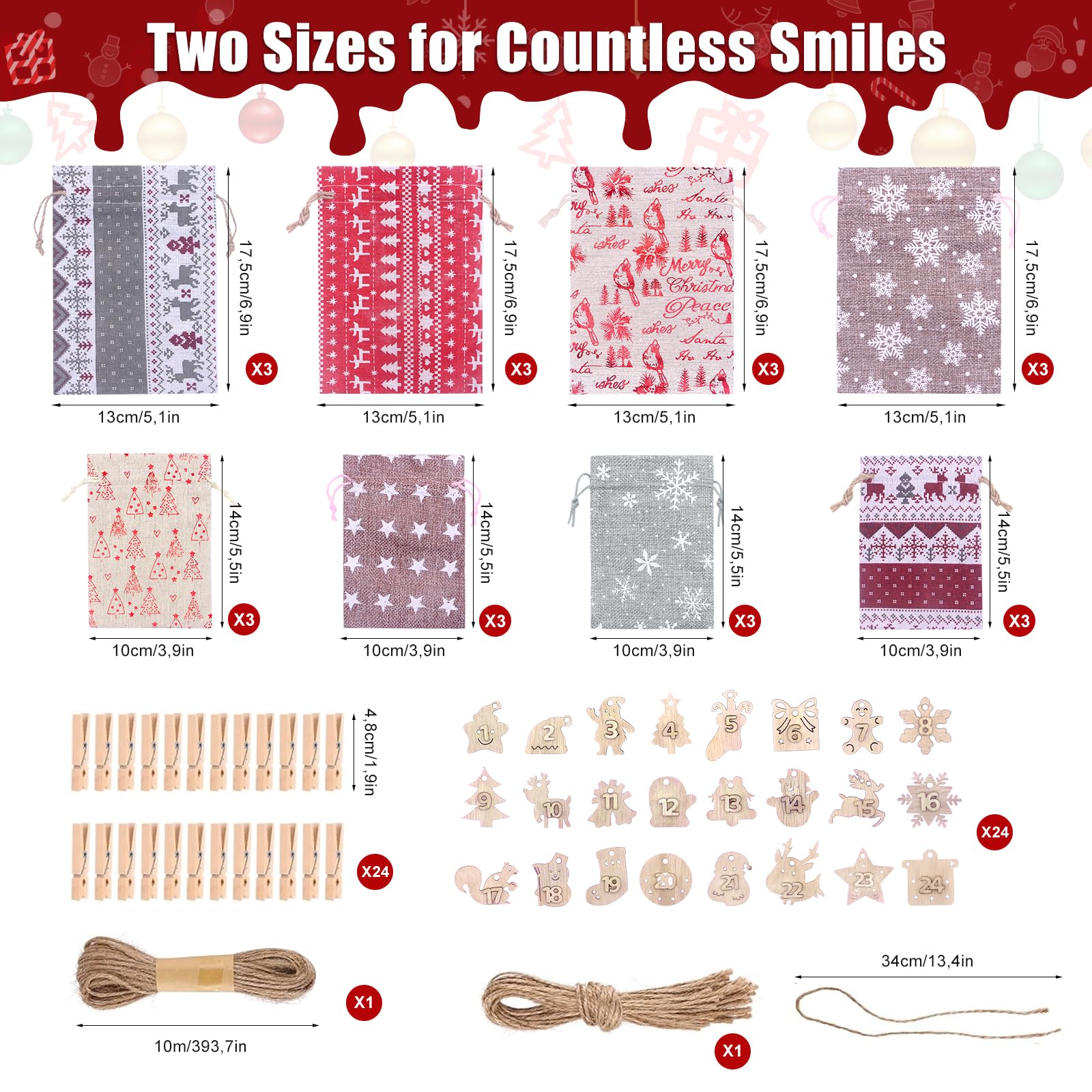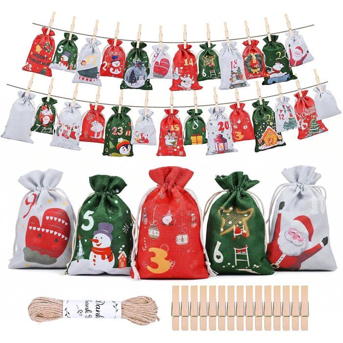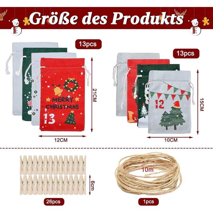 Calendrier de l'Avent Vide à Remplir : Ce set inclut 24 sachets imprimés, plus 2 supplémentaires et neutres. Calendrier de l'Avent 2025 à remplir soi-même, 24 Calendrier de l'Avent Sacs, Pochettes pour Noël, Faire soi Calendrier Noel avec Autocollants et Pinces en Bois Avec deux tailles (10x15 cm & 12x21 cm), ils s'adaptent à toutes les surprises : des bonbons aux jouets. Suspendez les sachets avec les pinces pour une installation rapide et élégante. Les sachets numérotés, reliés par une corde, se suspendent facilement. LAvent 2026 Sephora Calendrier De L'Avent Vide à Remplir, 24+2 Sac Calendrier De Décoration Noël Famille Finis les autocollants qui se décollent ! Le cordon de serrage évite les pertes. Leur fabrication soignée et lavable permet une réutilisation année après année. Un design durable et festif directement imprimé sur le tissu. Surprenez vos proches en les remplissant vous-même pour une attente de Noël magique. Décorations Complètes Incluses : Notre Calendrier de l'Avent Vide à Remplir inclut 26 pinces en bois et une corde de 10 mètres. Calendrier de l'Avent à remplir - SWAPY - 2025, 26 sacs tissu avec