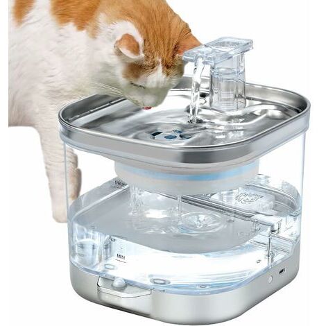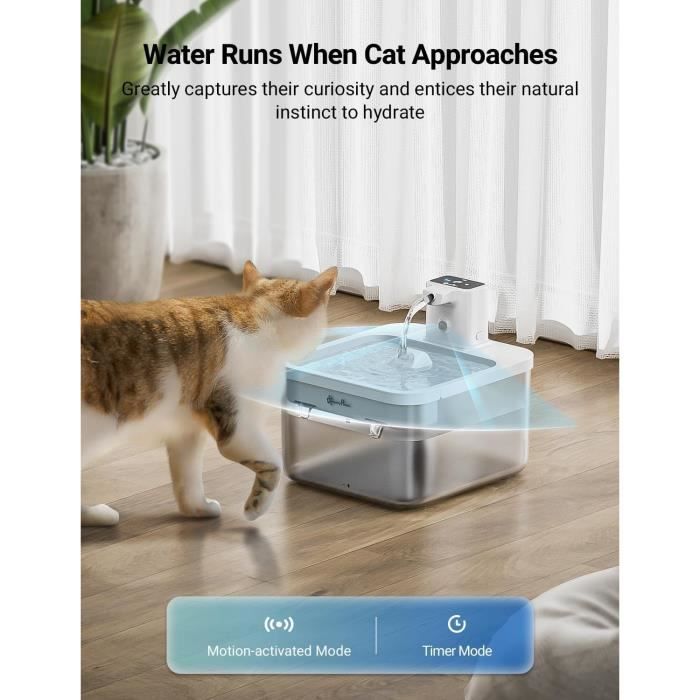 Fontaine Chat Automatique Batterie Fontaine à Eau Chat Sans Fil 2,8L Distributeur Automatique Rechargeable 4000mAh Fontaine Eau Chat Filtre Charbon Le coton filtrant microporeux filtre les poils et les impuretés fines, le charbon actif issu de coques de noix de coco purifie l'eau, et la résine échangeuse d'ions adoucit la qualité de l'eau et améliore son goût, garantissant ainsi à votre chat une eau pure et fraîche. Capacité : 2,8 L, idéal pour les chats ou les chiens dans une maison ou plusieurs personnes. Parfait pour une journée entière ou un court voyage. Il dépasse de loin la quantité d'eau qu'un chien peut boire pendant sept jours. Le petit ventre d'escargot vous permet de ne pas vous inquiéter Achetez Fontaine a Eau Chat sans Fil, 2,8 L Fontaine à Eau pour Chat et Chiens Silencieuse avec Detecteur de Mouvement, 4000mAh Rechargeable Batterie, Distributeur Eau Chats Automatique Fontaine à eau sans fil pour chat avec capteur de mouvement : La fontaine à eau pour chat dispose de 3 modes de fonctionnement : (1) Mode induction : elle commence à fonctionner lorsque le chat est près de la fontaine à eau pour chien et la distance de détection est de 1,5 mètre. (Veuillez rechercher “B0FHPR7VJ8” pour acheter le filtre adapté., ) Fontaine sans fil d'eau pour chat sans fil : Togo Chaque goutte est pure : la fontaine à eau pour chat fournit une eau fraîche et favorise la consommation d'eau de votre chat. Description du produit Fontaine a Eau Chat sans Fil, 2,8 L Fontaine à Eau pour Chat et Chiens Silencieuse avec Detecteur de Mouvement, 4000mAh Rechargeable Batterie, Distributeur Eau Chats Automatique Mode d'emploi Veuillez nettoyer régulièrement le distributeur d'eau Vous pouvez l'utiliser dans les endroits préférés de votre chat : salon, chambre, cuisine, salle de bain, extérieur, etc. Après une charge complète, la fontaine à eau pour chat peut fonctionner en mode induction pendant 50 jours. Batterie rechargeable : Fontaine a eau pour chat fonctionnant sur batterie ou avec un câble d'alimentation. Dotée d'un dispositif de sécurité, la pompe s'arrête automatiquement lorsque le niveau d'eau est bas. Pompe de fontaine à chat silencieuse et intelligente - Cette fontaine à chat sans fil en acier inoxydable est dotée d'une pompe silencieuse de 30 décibels, garantissant un environnement paisible. Fontaine sans fil pour chat : Les fontaines à eau pour chat à piles offrent la commodité d'un environnement sans fil pour fournir de l'eau à votre chat à tout moment et en tout lieu.