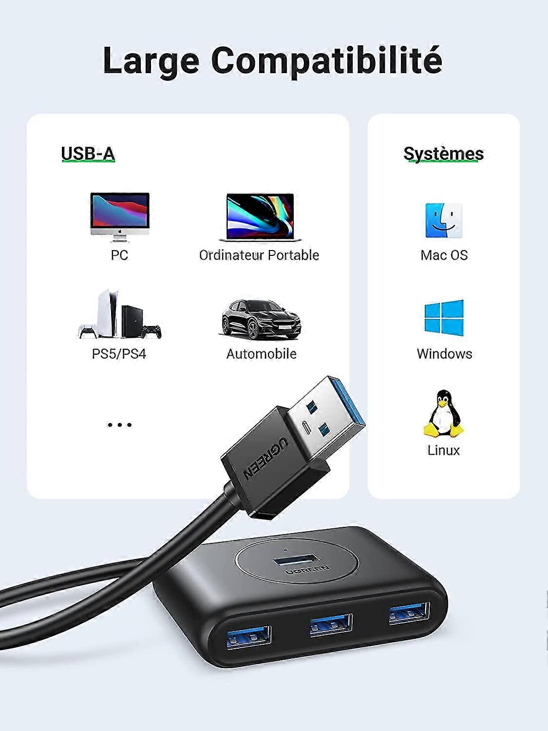 Élargissez la connectivité de votre portable ou de votre PC avec ce puissant hub USB 3., 0 à 4 ports., Avec 1 port USB 3., 0, 2 ports USB 2., 0 et 1 port USB-C Power Delivery, qui peut être utilisé à la fois pour le transfert de données et pour l'alimentation, ce hub offre une flexibilité maximale pour tous vos appareils., Le hub USB 3., 0 prend en charge des vitesses de transfert allant jusqu'à 5 Gbps, ce qui vous permet de transférer de gros fichiers en un temps record ou de faire fonctionner des périphériques exigeants sans perte de performance. Hub USB 3.0 avec câble étendu de 180 cm de long, 4 ports USB 3.0 ultra fin, répartiteur multi-ports USB, adaptateur multiport USB pour ordinateur portable, PC, MacBook, clés USB Le design plug-and-play permet une utilisation immédiate sans installation de pilotes supplémentaire. Large compatibilité : Compatible avec Windows, macOS, Linux et Chrome. Ce hub offre des performances fiables et une protection pour vos appareils connectés, qu'ils soient stationnaires ou mobiles. Hub 4 Ports USB-C PD 8 In 1 USB C Hub 10Gbps Multiport Adapter With 4K HDMI, 3 USB-C 3.2 Gen 2, 3 USB-A 3.2, 100W Power Delivery, USB Hub Compatible With MacBook Pro/Air, Chromebook And Hub USB-C Transfert Données 5 Gbps Transferts de données rapides : Ce hub USB 3., 0 prend en charge des vitesses de transfert de données allant jusqu'à 5 Gbit/s et est rétrocompatible avec l'USB 2., 0., Transférez de gros fichiers ou connectez des périphériques exigeants sans compromettre la vitesse. Plug-and-play, pas de pilotes requis : Facile à installer - branchez simplement sur le hub et commencez immédiatement. Le design compact est parfait pour les voyages, le bureau ou la maison. Conception à 4 ports avec alimentation USB-C : Le hub offre 1 port USB 3., 0, 2 ports USB 2., 0 et 1 port Type-C pour l'extension de transfert de données et d'alimentation des appareils. Mini Hub USB Extensions, Hub USB 3.0 4 Ports, Hub 2.0, Station Adaptateur USB, Hub de Données Portable Ultra Mince, Séparateur USB Aluminium Flexibilité pour étendre vos options de connectivité. Hub USB-C multiport 4 en 1]Transformez un port USB-C en 4 ports USB haut débit (2 USB-C 3.2 et 2 USB-A 3.2), permettant la connexion simultanée de 4...