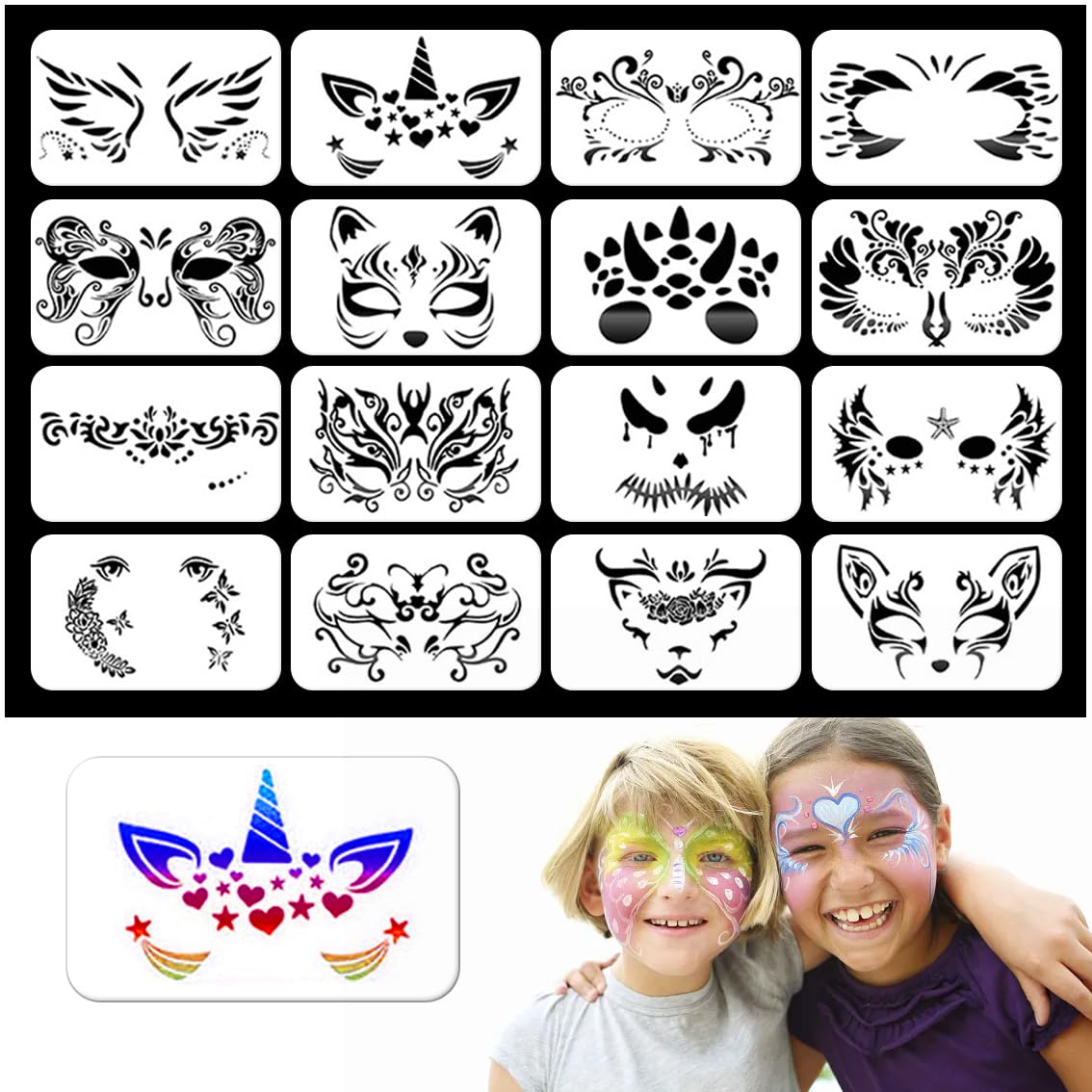 SURENHAP Modèle de peinture de visage Modèle de Peinture Faciale PET Pochoir Maquillage Yeux SRIZIAN 25 Pièces Pochoirs De Peinture Pour Visage, Modèles Tatouage Réutilisables, Pochoirs Tatouage Pour Les Yeux Pochoirs Peinture Corporelle Pour Les Enfants Fête Vacances Halloween Maquillage Pochoirs Maquillage Visage Largement utilisés : ces pochoirs de peinture pour visage sont parfaits pour la peinture du visage, le maquillage du visage, le maquillage d'Halloween, le carnaval et d'autres célébrations. Dimensions de l'emballage : 23 x 15 x 2 cm. Lot économique : le produit comprend 16 pochoirs réutilisables pour maquillage du visage et peinture acrylique, la quantité est suffisante pour vos différents besoins. Achetez 16 Pièces Pochoirs de Peinture de Visage,Pochoir Maquillage Faciale,Pochoir Tatouage Réutilisables pour Enfants Artistes,Halloween,Cosplay,École : Aides pour dessin et lettrage Matériau de qualité : nos pochoirs pour peinture faciale sont fabriqués en PET, doux et pliable, durable, sûr et fiable, lavable à l'eau, faciles à utiliser encore et encore. Avis clients · Facilité d'utilisation (4,4/5) · Rapport qualité / prix (4,3/5) · Performance (4,8/5) · Simplicité d'entretien (4,9/5 【Facile à utiliser】L'ensemble du pochoir a la forme d'un masque, conforme à la structure du visage, il suffit de placer le pochoir sur votre visage et d'appliquer la peinture pour le visage pour une peinture réussie. Poids de l'emballage : 80 g.