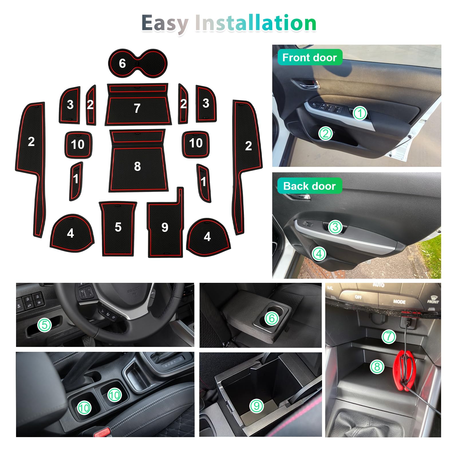 Pièces Détachées Suzuki Vitara GAFAT Suzuki Vitara LY IV-4 Hybrid 2016-2024 2025 (Automatique) Tapis Antidu00e9rapants, Vitara 2023 Tapis En Caoutchouc Pour Console Centrale, Couture De Porte, Suzuki Vitara Accessoires (Rouge Suzuki Grand Vitara 1 ★ Offre une bonne adhérence et améliore la sécurité de conduite La surface est dotée d'un design en grille pour réduire le bruit de glissement et de frottement des objets. Le dessous est collant et antidérapant, de sorte que le tapis reste en place même en cas d'arrêts brusques ou de virages. Veuillez nous contacter si vous avez des questions., 3., Tapis personnalisé gratuit dans la taille appropriée. Nettoyer votre tapis n'a jamais été aussi facile. Nous offrons également un service de design personnalisé gratuit pour les tapis antidérapants de tailles (Veuillez nous contacter pour plus d'informations). Ne vous inquiétez pas. Le tapis est entièrement étanche. Les Tapis Antidérapants en Caoutchouc GAFAT offrent une protection complète pour votre 2016-2025 Suzuki Vitara (Transmission Automatique)! Tapis de sol caoutchouc 3D Suzuki Vitara II (2015-2018) - Rabais de 20 ★ Protection complète pour votre voiture Protéger la console centrale, le porte-gobelet, les portes et autres pièces contre les liquides, la poussière, les objets tranchants, etc. Tapis de sol caoutchouc 3D Suzuki Vitara II (2015-2018) - Rabais de 20 【Design original pour voiture】 Suzuki Vitara LY iV-4 / Hybrid / Facelift / S Sport / Limited / 4x4 SUV 2015 2016 2017 2018 2019 2020 2021 2022 2023 2024 2025 (Uniquement pour Transmission Automatique) [Attention : Pas pour Transmission Manuelle!, ] ★ Excellent matériau, non toxique et sans goûtLe tapis est fabriqué en matériau composite en caoutchouc PVC, agréable au toucher et peut être étiré et tourné selon vos envies. Habituellement, une petite poignée est attachée au tapis, qui sert à installer et à retirer pour le nettoyage. Modèles compatibles : [Transmission Automatique]Suzuki Vitara LY iV-4 / Hybrid / Facelift / S Sport / Limited / 4x4 SUV 2015 2016 2017 2018 2019 2020 2021 2022 2023 2024 2025[Attention : Pas pour Transmission Manuelle !, ]Remarque :1., Veuillez vérifier le modèle avant de passer commande pour assurer que votre modèle correspond., 2., Garantie 12 mois. ★ Beau et élégant, plein de sensations sportivesDesign contrasté de couleur personnalisé qui ajoute de la couleur à l'intérieur de votre voiture. 【Protection complète de votre voiture】 Ces tapis sont utilisés dans différents intérieurs de véhicules pour protéger la console centrale, la boîte d'accoudoir, le porte-gobelet, les coutures de porte et d'autres pièces contre les dommages causés par des liquides ou des objets tranchants, ce qui permet de garder l'intérieur du véhicule propre et bien rangé, réduisant ainsi les coûts d'entretien ou de remplacement du véhicule. Les Tapis Antidérapants en Caoutchouc GAFAT offrent une protection complète pour votre 2016-2025 Suzuki Vitara (Transmission Manuelle)! ★ Protection complète pour votre voiture Le dessous reste antidérapant et le véhicule reste en place lors du freinage ou des virages. 【Forte résistance au glissement, amélioration de l'indice de sécurité de conduite】 La surface est munie d'une structure en grille concave-convexe dense pour réduire le bruit de glissement et de frottement d'objets tels que les téléphones portables, les clés et les lunettes de soleil.