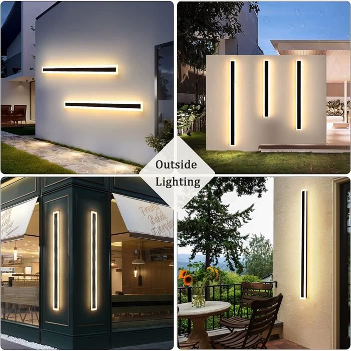Lampe Extérieure Longue IP65 Applique Murale Longue Led Exterieur Et Intérieure, Rgb Noire Villa Luminaire Exterieur En Lumière Chaude 3000K étanche Elle peut être installée horizontalement ou verticalement, et plusieurs lampes peuvent être combinées pour créer un concept d’éclairage unique qui enrichit l’ambiance et la profondeur de l’espace NETTLIFE applique murale LED applique extérieure 100CM noir 3000K IP65 longue 26W villa en... Vous voulez ajouter une touche élégante à vos murs ? Avec nos appliques extérieures LED, solaires ou design, trouvez la vôtre en magasin Température de couleur : lumière chaude 3000 K., Certifié : CE À propos du produit : La applique murale longue extérieur LED pour terrasse est livrée avec un manuel d’installation et les accessoires nécessaires, ce qui facilite son montage mural. ZTWLEED Applique Murale Exterieur,12W Longue Applique Murale LED,IP65 Elle convient également parfaitement aux espaces intérieurs tels que cages d’escalier, couloirs, salons et chambres. Longue Luminaire Exterieur Vidéo de marchand Son corps mince de seulement 4., 5 cm s’adapte à différents types de murs, comme les murs en briques, en bois ou en béton. Lampe extérieur murale longueur : 40/60/80/100 cm, largeur : 4., 5 cm ; hauteur : 4., 5 cm ; la puissance : 8W/12W/16W/20W, pour tension 220–240 V. À l’intérieur, une source lumineuse LED puissante et étanche diffuse une lumière douce et uniforme, sans scintillement Applique murale intérieure/extérieure : Cette appliques LED est idéale pour les villas, jardins, terrasses, cours, garages, balcons, entrées, porches et murs extérieurs. Idéale pour les environnements extérieurs exigeants, elle reste fiable même sous forte pluie, vent ou froid. Lumière extérieur LED : Cette élégante éclairage mural d'extérieur noire au format allongé séduit par son design minimaliste et rectangulaire aux lignes épurées.