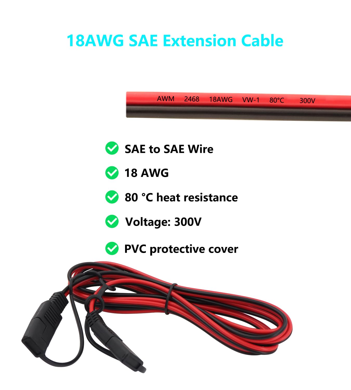 【Câble d'extension SAE】 Câble :18 AWG. Le paquet comprend : 1 X Câble d'extension SAE 18AWG. Connecteur SAE à déconnexion rapide, conception de câble à balle, convient pour les projets de câblage électrique, les projets de panneaux solaires, les voitures, les motos, les projets de camping-car, etc SAE 2 Broches Connecteur Rapide DéConnexion Prise SAE Puissance Câble D... Matériau : conducteur en cuivre étamé. Câble d'extension SAE 12 AWG 90 cm, connecteur SAE à déconnexion rapide Contenu de l'emballage : 1 X Câble d'extension SAE 18AWG, 1 X Adaptateur de polarité inversée SAE 【Câble SAE】Chaque port du câble solaire est équipé d'un capuchon de protection, de sorte que l'interface de connexion rapide SAE peut bloquer la contamination des liquides étrangers et des particules solides lorsqu'il ne fonctionne pas, et garantir que l'intérieur est propre et sec, et peut fonctionner parfaitement même dans des environnements difficiles. Câble Extension SAE 18AWG LANMINGLEL 18AWG SAE Câble D'extension SAE à SAE Connecteur Rapide Panneaux Solaires 1 X Adaptateur de polarité inversée SAE Largement utilisé : câble d'extension SAE 18AWG utilisé dans tous les types de véhicules et d'appareils, tels que l'automobile, la moto, la tondeuse à gazon, le RV, le moteur à traîne, le VTT, le kayak, le pulvérisateur de tracteur, l'onduleur de puissance et d'autres appareils avec ports sae. Description du produit : Câble : 18 AWG. Matériau du conducteur : conducteur en cuivre étamé.