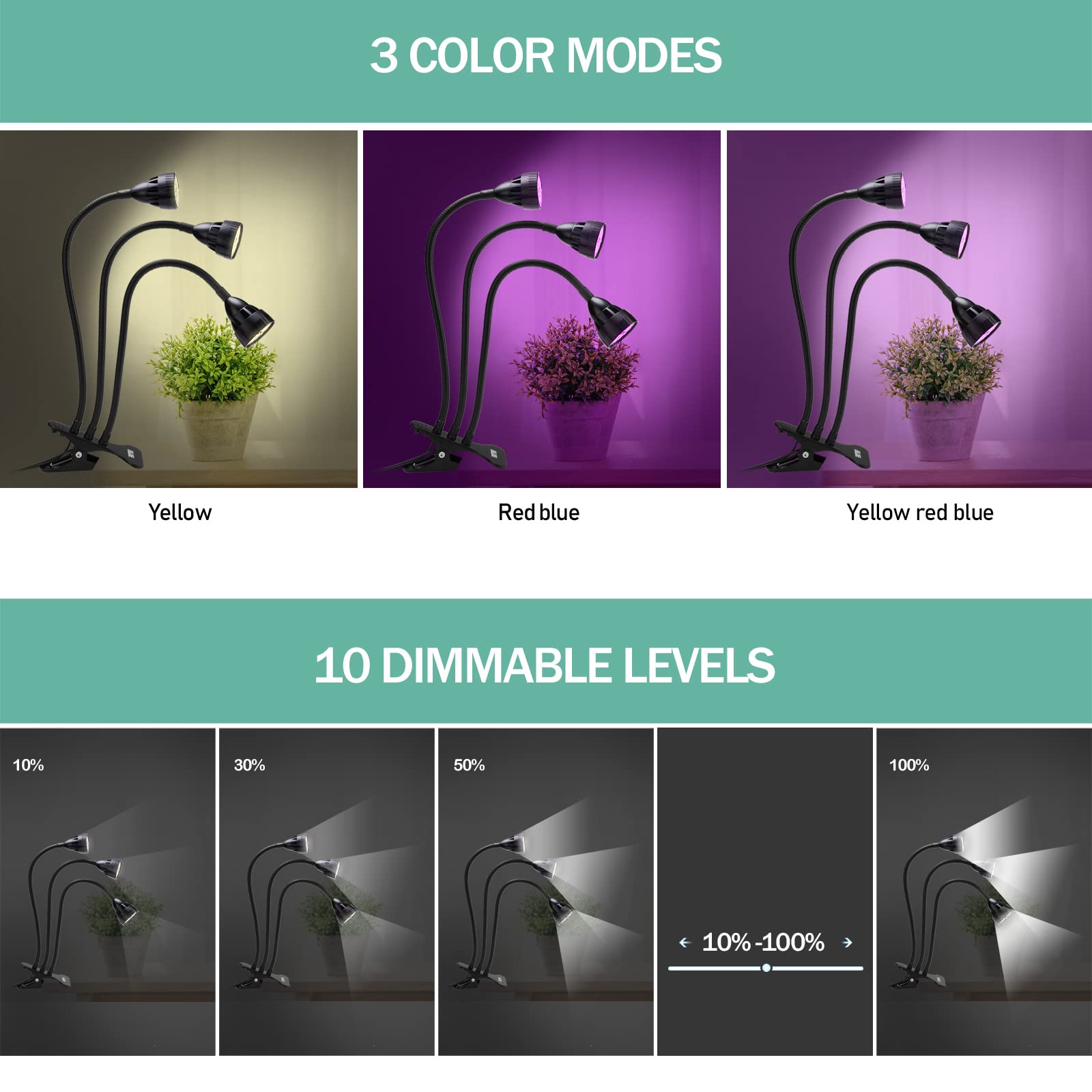 Plant light LED full spectrum: LED growth lamp consists of 45 highly efficient LED beads, including all wavelengths required for plants from germination to flowering and fruiting. La lampe de culture est conçue avec trois têtes, vous pouvez modifier la luminosité en fonction des besoins de croissance des plantes Triple Flexible Gooseneck Design: This plant lamp uses a soft, flexible and foldable gooseneck design, and the lighting angle can be adjusted by 360., It can be adjusted to any angle and lighting position. La lampes de culture à LED spectre complet permet à vos plantes de prospérer même la nuit ou en l'absence de soleil! Répondre aux besoins des plantes à différents stades de croissance. 3 Têtes Flexibles Réglables Lampe De Plante,80 LEDs Lampe De Croissance Lampe Horticole LED Pour Lampe Croissance Plantes LED You can easily switch 3 light modes yellow red blue / red blue / yellow and 10 dimming levels. 🌺3 modes d'éclairage & 10 niveaux de luminosité🌺 : la lampe pour plantes peut être utilisée à la fois via le panneau de commande. Vous pouvez facilement commuter 3 modes d'éclairage (jaune rouge bleu / rouge bleu / jaune) et 10 niveaux de gradation. Meet the needs of plants in different growth stages. Dispositifs d'éclairage de croissance Lampe de Croissance,Spectre 🌼Lampe Horticole à Spectre Complet 🌼 Les lampes de culture à LED sont constituées de 66 LED de croissance efficaces contient la toutes les longueurs d'onde de dont les plantes ont besoin de la de la germination à blossom et à la fructification. Lampe de Plante 3 Têtes BELOEE lampe de culture pour plantes équipé 360°d'un col de cygne flexible et col de antidérapante agrafe fournit une zone...