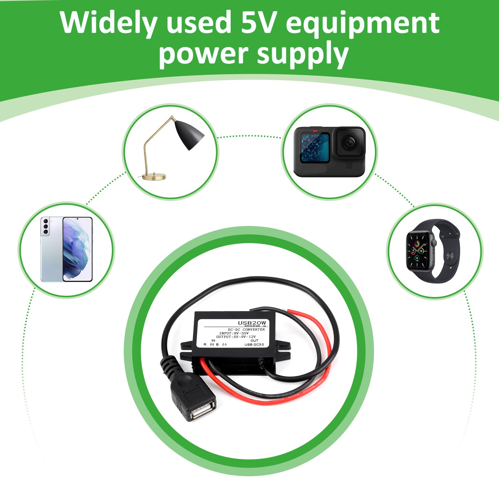Tension de sortie: 5V; Courant de sortie: 3A max; Puissance de sortie: 15W Max. Plage de tension d'entrée: 8 - 32v Tension d'entrée nominale: 12 / 24V Efficacité de transmission: 95% Tension de sortie: 5V Courant de sortie maximal: 3A Puissance de sortie maximale: 15W Indice de protection étanche ip68., Entrée: Rouge (+) noir (-) Sortie: jaune (+) noir (-) Il est interdit aux non - professionnels de se démonter eux - mêmes. Avec une efficacité de conversion supérieure à 95%, le convertisseur DC 8 - 32v abaisseur 5V est durable et offre une meilleure isolation. Qiilu Transformateur d'alimentation LED Adaptateur de convertisseur de Prend en charge la protection contre les courts - circuits de sortie, la protection contre les surintensités et la protection contre les surchauffes. Étanche IP68 | Le convertisseur est encapsulé avec de la résine époxy étanche et permet une utilisation individuelle, par exemple à l’extérieur comme source d’alimentation pour l’éclairage ou en mer, installée sur des bateaux Convertisseur 24v 12v MZHOU DC 12V/24V U00e0 5V 3A Max 15W USB A Convertisseur De Tension, DC/DC 8-32V U00e0 USB-A Module D'alimentation Buck Femelle Avec Fusible, U00e9tanche, Pour Alimentation 12v 3a Avec une efficacité de conversion supérieure à 95%, le convertisseur DC 8 - 32v abaisseur 5V est durable et offre une meilleure isolation. Prend en charge la protection contre les courts - circuits de sortie, la protection contre les surintensités et la protection contre les surchauffes