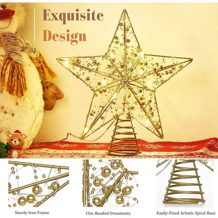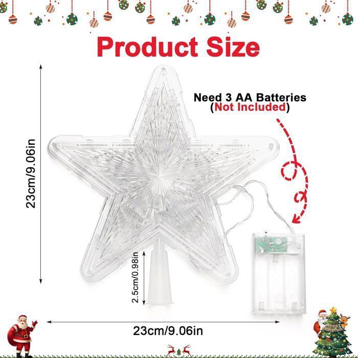 Cette décoration de cime d'arbre comprend des lumières LED intégrées qui créent une ambiance captivante, parfaite pour les décors intérieurs. L'étoile de sapin de Noël est adaptée pour les mariages, les activités de plein air/intérieur, les festivals, les fêtes et autres décorations pour rendre votre maison plus flexible et plus chaleureuse L'extérieur scintillant reflète magnifiquement la lumière, ce qui en fait une pièce remarquable pendant la période des fêtes. En raison des différentes mesures manuelles, veuillez prévoir une différence de taille de 1 à 2 cm. Décoration festive améliorée : avec son ajustement universel au sommet de l'arbre et sa silhouette d'étoile profilée, la cime d'arbre en forme d'étoile de Noël avec lumières intègre une fixation sécurisée pour un placement fiable, offrant un effet visuel époustouflant qui complète les arbres de Noël dans les environnements résidentiels ou commerciaux. étoile Lumineuse Sapin Noël Décoration De Noël Étoile Pour Cime De Sapin, Lumineuse LED 25x28 Cm, Avec 10 LEDs Lumière Chaude | Leroy Merlin Cimier Lumineux Sa conception polyvalente lui permet de s'intégrer parfaitement à divers environnements, offrant une esthétique de vacances intemporelle. Compatibilité polyvalente avec les arbres : offrant une compatibilité polyvalente avec les arbres, cette étoile de Noël s'intègre parfaitement à différents modèles d'arbres, offrant une brillance constante et devenant la touche finale parfaite pour les décorations festives dans divers environnements comme les salons, les ou les espaces événementiels. Cette cime de sapin de Noël est fabriquée avec une structure robuste en fer forgé, offrant des propriétés résistantes à la déformation qui garantissent une conservation de forme à long terme, gardant votre pièce maîtresse de vacances aussi magnifique que le premier jour où vous l'avez utilisée, parfaite pour créer de précieux souvenirs saisonniers. Spécification :Nom du produit : décoration pour sapin de Noël. LAMPHOME Étoile décorative pour sapin de Noël, maison de Matériel: ferTaille du produit : (remarque selon l'image)Poids : environ 140gAlimentation : 2 piles AA (non incluses)Liste de colisage :1 * cime d'arbre de NoëlRemarque :En raison des différents paramètres d'éclairage et d'écran, la couleur de l'article peut être légèrement différente de celle de l'image. Le montage est un jeu d’enfant ; une petite pince maintient l’étoile ensemble et il ne reste plus qu’à la poser sur la tige métallique. Avec Isa comme décoration de Noël sur le sapin, Noël devient quelque chose de très spécial