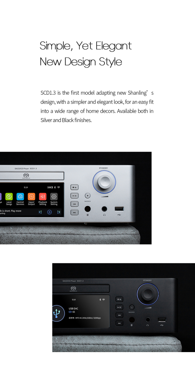 Ampli Casque Intégré Audiophile Shanling SCD1.3 Black | Lecteur SACD/CD à Genève Dac Haute Résolution 32bit 768khz SHANLING SCD1.3 Lecteur CD SACD DAC AKM4499EX AKM4191EQ Noir SHANLING SCD1.3 Lecteur CD SACD DAC AKM4499EX + AKM4191EQ Argent Le Shanling SCD 1., 3 est un lecteur audio polyvalent qui combine un lecteur CD/SACD de haute qualité, un DAC performant supportant jusqu'à 32 bits / 768 kHz et DSD512, avec une connectivité sans fil avancée via Bluetooth LDAC/aptX HD, AirPlay, et DLNA. Doté d'un puissant ampli casque intégré et d'une interface utilisateur intuitive grâce à son écran tactile et une application mobile dédiée, ce lecteur est conçu pour offrir une expérience d'écoute de haute résolution exceptionnelle pour les audiophiles exigeants.