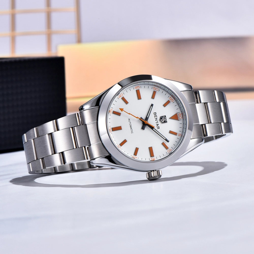 Montre Automatique Homme BENYAR-Montre De Sport étanche En Acier Inoxydable Pour Homme Montre Bracelet Ajustable Homme Matériau du bracelet : acier inoxydable., Cadran : Hardlex. Bracelet en acier inoxydable : anti-corrosion, la boîte contient un extracteur de chaîne, vous pouvez enlever les maillons supplémentaires en fonction de la taille de votre poignet. Contenu : 1 montre, 1 boîte d'origine, 1 manuel d'instructions (français non garanti), 1 chiffon de nettoyage, 1 ajusteur de bracelet. Emballage et service après-vente : le paquet comprend 1 montre O, 1 manuel du produit, 1 chiffon de nettoyage, 1 outil de retrait de chaîne. Si vous rencontrez des problèmes lors de l'utilisation, n'hésitez pas à nous contacter. Le travailleur d'affaires semble calme et stable, loisirs quotidiens légers et discrets, peut être adapté à toutes les occasions. Durable, confortable et polyvalent, ce qui rend les détails sur le poignet plus remarquables. Si vous rencontrez des problèmes lors de l'utilisation de la montre, n'hésitez pas à nous contacter. La montre BENYAR pour homme : Un cadeau intemporel et élégant pour l'homme moderne Passez une bonne journée. Montre automatique Benyar, dotée d'un mouvement à remontage automatique visibles via le fond transparent. Chronométrage précis et fiable pour un suivi du temps parfaitement sécurisé Cette montre de luxe à l'élégance sportive est le premier choix des amateurs de montres tendance. Matériau : Matériau du boîtier : alliage. Avec boucle déployante, la boucle est stable et ne tombe pas facilement. La couleur de la montre peut varier légèrement en raison des effets de lumière. Une immersion excessive dans l'eau réduira la durée de vie de la montre. Montre automatique Benyar pour homme : le fonctionnement parfait du mouvement à remontage automatique peut être vu à travers le fond transparent, et le chronométrage est stable et sûr. Montre classique pour homme : cadran minimaliste de 40 mm avec aiguilles orange éclair très plein de dynamique et d'énergie, avec une finition polie et une lunette lisse. Cette montre de luxe à l'élégance sportive est le premier choix des amateurs de montres tendance Largeur du bracelet : 20 mm. S'il n'est pas porté pendant une longue période, il doit être remonté manuellement régulièrement pour maintenir le mouvement en marche.