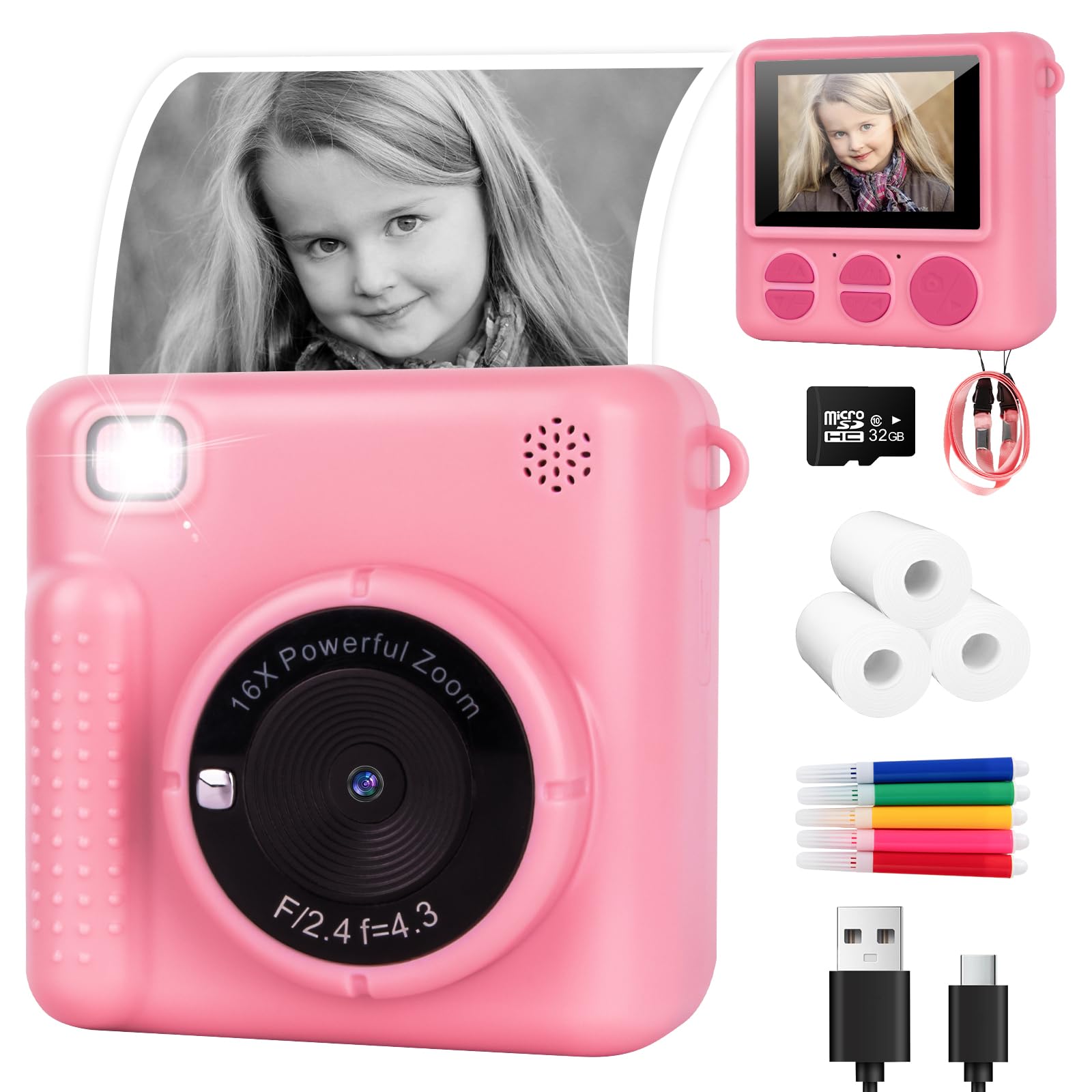 Gofunly Appareil Photo Instantané Enfant 2,4 Pouces - Caméra Vidéo Numérique 1080P Avec Carte 32GB