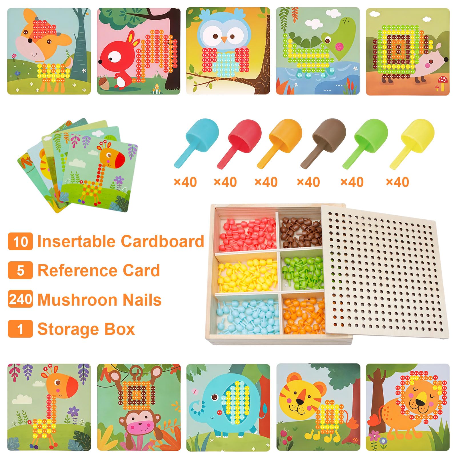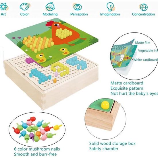 Vlecexs Mosaique Enfant de 2 3 4 5 Ans, Jeux Educatif Enfant Mosaïque Colorée, Mosaïque Enfichable avec 240 Perles Enfichables, Cadeaux de Noël pour Enfants, Garçons et Filles à Partir de 2 Ans La plupart des jeux de mosaïques enfant ne conviennent qu' à partir de 3 ans en raison de la présence de petits éléments qui pourraient comporter des risques d'étouffement 【Ensemble de puzzle mosaïque】Ce mosaique enfant en bois comprend un panneau perforé, 10 cartes avec différentes images, 5 cartes de référence et 240 marqueurs de couleur. Le fond de la boîte de rangement est séparé pour un rangement sûr. Un excellent jeu de puzzle en mosaïque Montessori pour les enfants de 2, 3 et 4 ans et plus. Puzzle Perles Colorées Bois Mosaique Enfant Puzzle 3D Construction Enfant Jeu Montessori Kit Mosaique 223 Pcs Pour Enfant Mosaïque Enfichable 240 Perles De nombreux accessoires sont fournis pour divertir votre enfant. Ils peuvent développer la concentration et la créativité des enfants, et leur permettre d'exercer leur esprit en développant leurs propres idées. Le puzzle mosaïque est livré avec une boîte de rangement pour ranger tous les clous et les images à la fin du jeu, ce qui le rend facile à ranger et peu encombrant. Ce puzzle mosaïque est le cadeau idéal pour les enfants, filles et garçons. Clic Educ Mosaique Kit De Mosaïque Pour Enfants 2-4 Ans - 240 【Qualité supérieure】le puzzle mosaïque en bois est fabriqué en bois de haute qualité. Les couleurs vives et les jolies formes d'ongles en forme de champignon contribuent à susciter l'émerveillement et la créativité, ce qui en fait un excellent bricolage pour les petits artistes