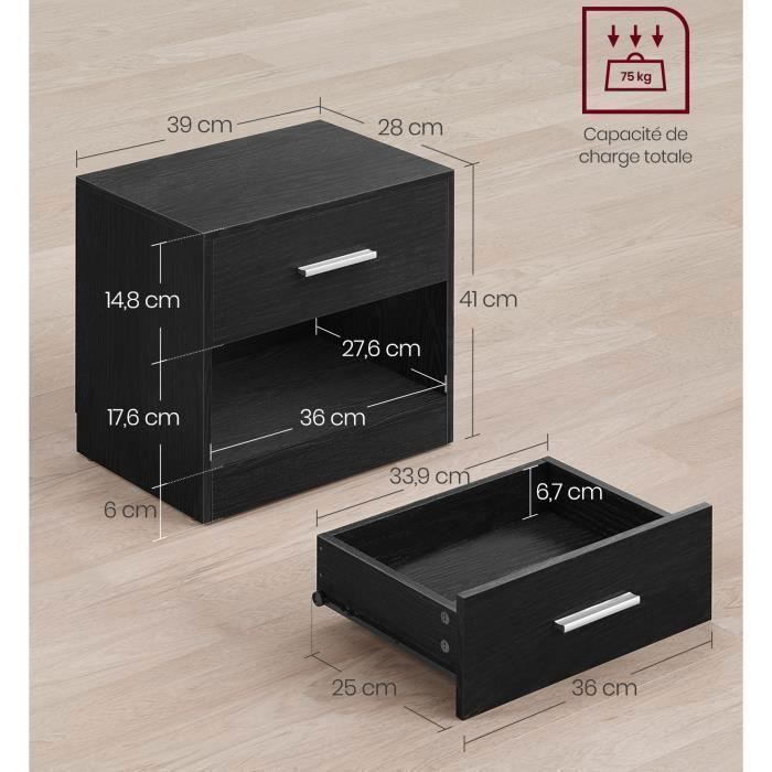 Sweetcrispy Sweetcrispy Table De Chevet Lot De 2, Table De Table Side Table Fabric Drawer Cabinet Narrow Cabinet Chest Of Drawers Bedroom Industrial Style For Living Room Children S Room Hallway Storage Cabinet P 51923506 Commode Etroite Chambre Tables De Chevet - VASAGLE - Étroite Avec 2 Tiroirs Et Compartiment Ouvert - Noir D'Encre - Maison Armoire étroite Rangement Salon L'ensemble de l'armoire à tiroirs peut être assemblé en 15 à 30 minutes. Robuste et stable : la table de chevet Sweetcrispy avec 2 tiroirs pliants, convient parfaitement à l'appartement en location ; fabriquée en métal fiable et en panneau de bois MDF durable, plus durable et plus beau que les armoires en plastique ; en tirant simplement sur les poignées en tissu, les tiroirs peuvent être facilement ouverts et fermés ; les pieds en plastique réglables protègent votre sol des rayures. est parfaite pour ranger vos vêtements, couvertures, écharpes, chaussettes et autres accessoires. lot de 2 tables de chevet blanches - commode à 2 tiroirs, armoire d'appoint ... table de chevet Petite commode de nuit pour chambre à coucher, blanc, 55x40x55cm Ajustement universel : placez cette armoire où vous le souhaitez ! Rangement de grande capacité : un ensemble de 2 tables de chevet est idéal pour ranger de petits objets à côté du lit ou du canapé. est parfait pour organiser vos vêtements, couvertures, foulards, chaussettes et autres accessoires Que ce soit dans la chambre de votre enfant pour les petits vêtements, dans l'entrée comme aide au rangement ou dans la chambre pour vos vêtements, cette commode est faite pour vous Le dispositif à bascule vous protège, vous et votre famille, contre les dommages