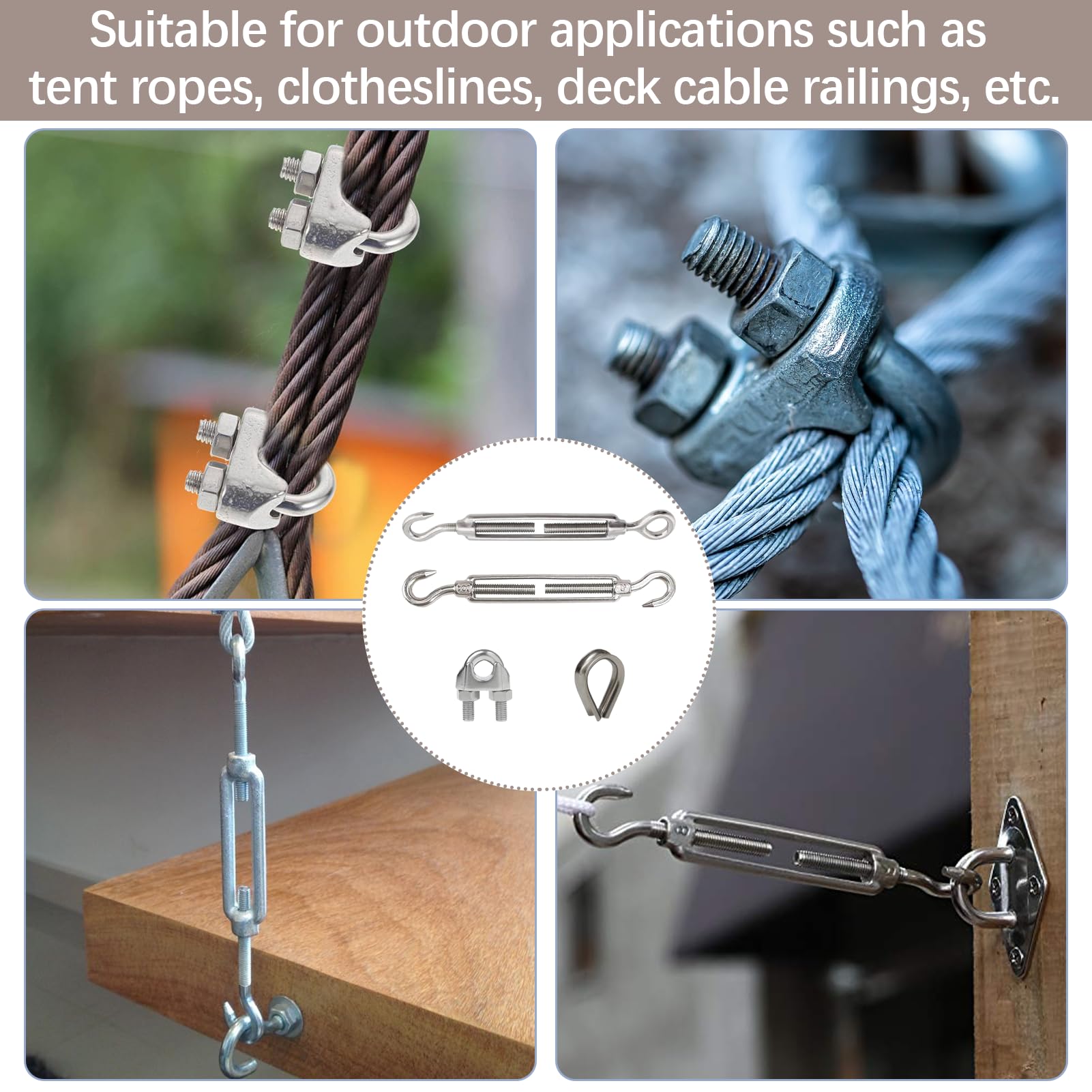 Tendeur à œil et crochet M4 noir, dispositif de Tension de câble métallique en acier inoxydable 304, filet d'ombrage, bâche d'installation, boulon à bride Il vous suffit de tourner les vis, puis d'ajuster et de serrer le câble. Accessoire Voile D'ombrage Corde à Linge QUARKZMAN M4 Crochet Et Oeil Tendeurs Pour Câble Fil D'acier Tension Tendeur De Câble Inox Matériau durable : Le tendeur de câble en acier inoxydable est fabriqué en acier inoxydable 304 durable, qui est anti-rouille, résistant à la corrosion, résistant à l'abrasion, de structure solide et dureté élevée. Contenu de l'emballage : 6Pcs de tendeurs réglables. Suffisamment durables et pratiques pour répondre à vos besoins quotidiens. Utilisations courantes pour les tendeurs : idéal pour le gréement de bateau, le serrage de câbles métalliques, le kit de matériel d'ombrage, la suspension de guirlandes lumineuses de qualité commerciale, les tendeurs de corde à linge, l'installation de tente, le kit de garde-corps en acier inoxydable Tendeurs, Chapes, Pitons, Accessoires : Tendeurs à œil et chape Facile à installer : Le tendeur de câble est amovible, réutilisable et peut être remplacé sans nécessiter d'outils spéciaux. Large gamme d'applications : Ces tendeurs en acier inoxydable 304 peuvent être utilisés à l'intérieur et à l'extérieur, tels que les fils de clôture, les voiles d'ombrage, les clôtures, les rampes de câbles, les cordes à linge, les accrochages de tableaux, les tentes, la ornementation intérieure, les filets de pêche, etc. Il ne rouille pas lorsqu'il est utilisé dans un environnement humide.