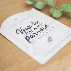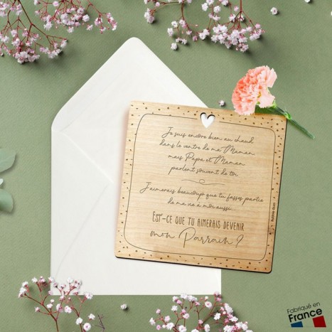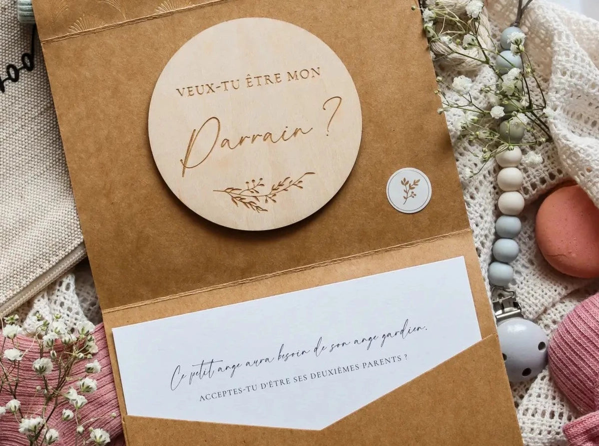 Pour toute question, n'hésitez pas à nous contacter. Veux-tu être mon parrain carte - Cadeau parrain - Annonce parrain marraine - France Célébrez une occasion unique avec nos cartes en bois personnalisées, une manière originale et pleine de charme de poser la grande question : "Veux-tu être ma super marraine pour toute la vie C'est une façon originale d'inviter quelqu'un à devenir votre parrain et de lui exprimer votre gratitude. 【Cadeau de Parrain】Ce coffret est un cadeau idéal pour votre parrain et lui fera un véritable plaisir. Personnalisez cette jolie carte de demande de parrain. Offrez ce cadeau et surprenez le futur parrain avec une jolie carte unique avec son prénom et prénom gravé de votre enfant. Cette carte d'annonce au parrain est gravée avec la question : Veux-tu être mon parrain 【Service Client】Nous nous engageons à fournir un excellent service client. 【Matériaux de Qualité Supérieure】L'ensemble carte et bracelet de parrain est fabriqué à partir de matériaux de haute qualité pour une durabilité et une beauté sobre. Cadeau Marraine Carte Bracelet "Veux-tu être Mon Parrain ?" - Bracelet Marraine Originale