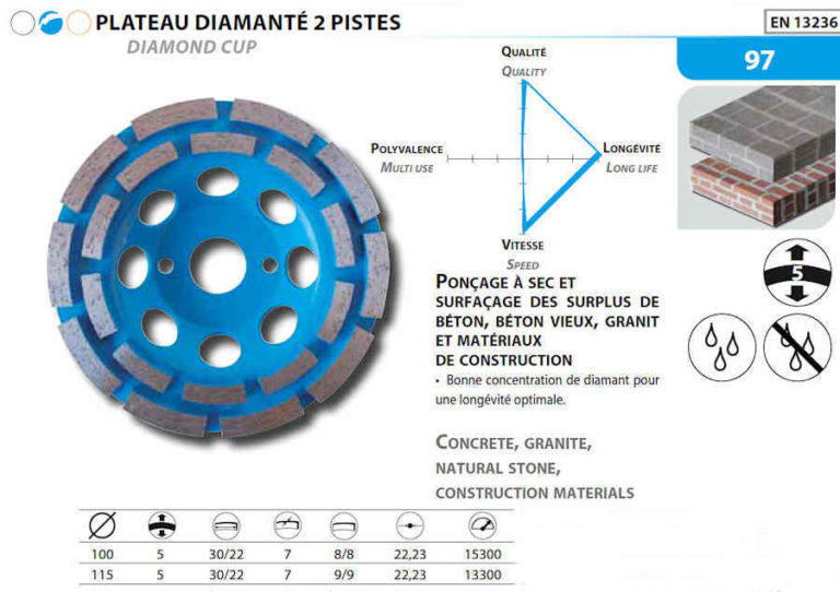 7Pcs Disque Diamant De Polissage 4"/100mm Sec Diamant Polissage Pads Pour Marbre Granite Pierre Beton 100 73727416 Disque Ponçage Granit Marbre RUBI Disque Diamanté De Polissage Humide 100mm G100 Fixation Velcro Disque Dégrossissage RUBI Grain 100 🔝 Pour le dégrossissage La gamme de disques de polissage, pour travaux à sec de RUBI est formée de différentes granulométries : 50, 100, 200, 400, 800, 1500 et 3000., Elles sont toutes identifiées et classées par couleur pour une identification rapide et facile. 🔺 Différentes granulométries, identifiées et classées per couleur pour une identification rapide et facile Le Disque diamant polissage et ponçage à sec 100 mm gr. 100 RUBI - 62971 est un outil essentiel pour les professionnels du bâtiment, offrant une excellente finition des surfaces en pierre et en béton 🛠️ Permet retirer les rayures et les dommages superficiels rapidement et facilement La gamme de disques de polissage, pour travaux à sec de RUBI est formée de différentes granulométries : 50, 100, 200, 400, 800, 1500 et 3000. Elles sont toutes identifiées et classées par couleur pour une identification rapide et facile ⚠️ Vitesse de fonctionnement maximale: 3000 tours par minute Les disques de polissage de grain 50 et 100 sont pour les travaux du début quand il faut un grain de plus grande taille et sa vitesse maximum de travail ne doit pas dépasser les 2000 tr/min Les disques de polissage de grain 200, 400 et 800 sont pour les travaux de meulage moyen et leur vitesse de travail maximum est de 5000 tr/min Les disques de polissage de grain 1500 et 3000 sont les plus fins et recommandés pour les travaux de polissage de finition.