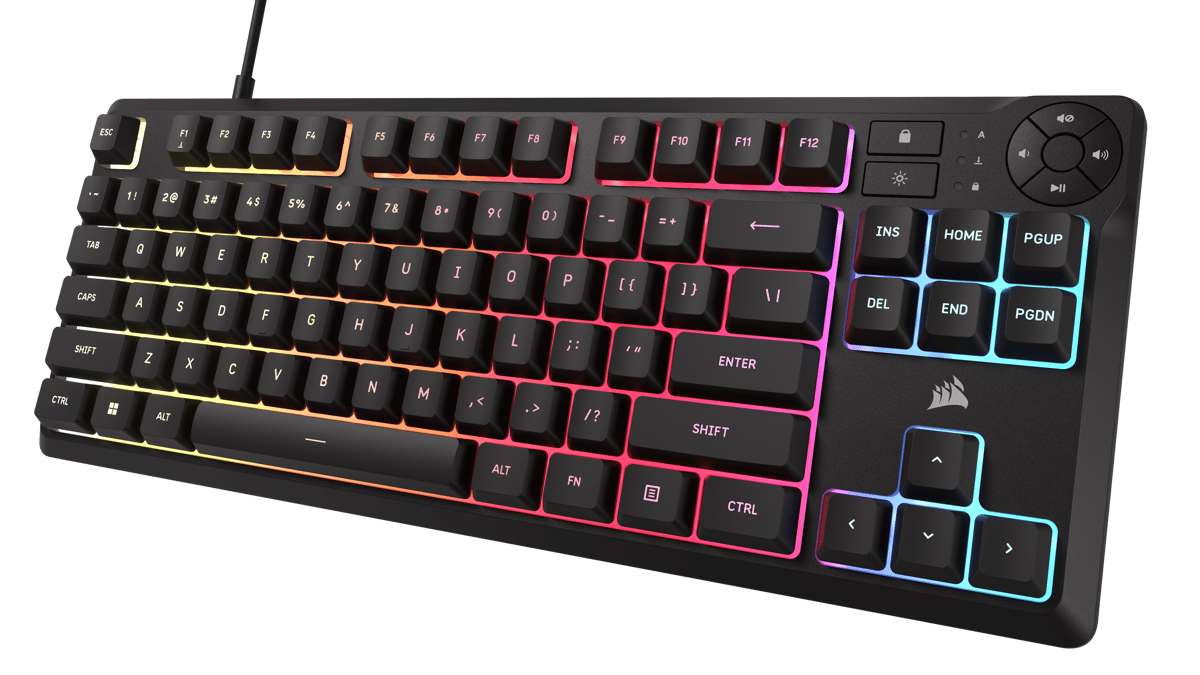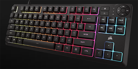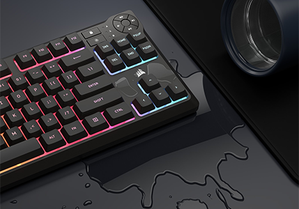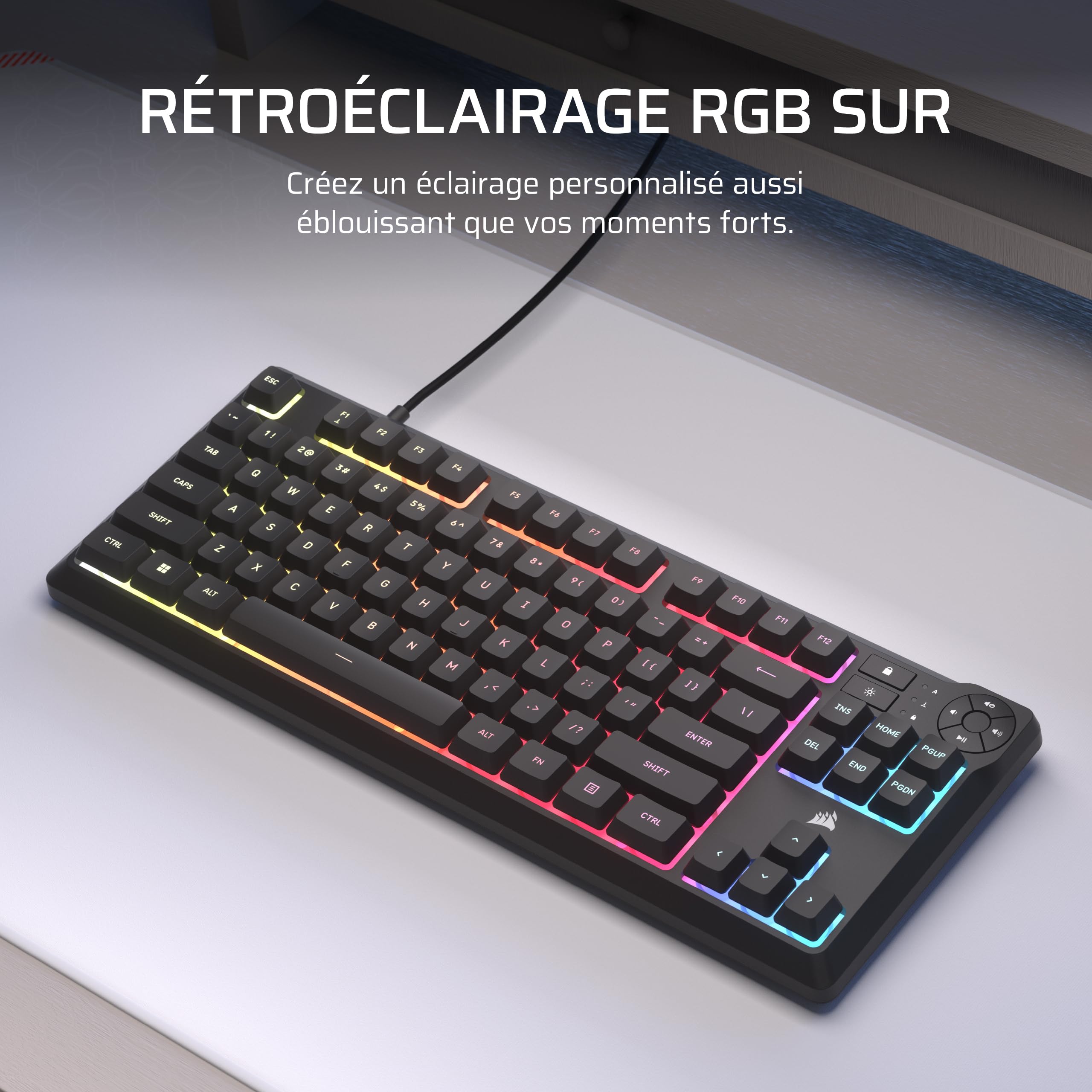 Le clavier gaming CORSAIR K55 CORE TKL est un clavier à membrane sans pavé numérique résistant aux éclaboussures, peu encombrant et élégant, qui supprime le pavé numérique pour donner aux joueurs davantage de place pour des parties sans fin. Le clavier K55 Core TKL RGB de Corsair vient cocher toutes les cases pour du gaming abordable avec quelques ajouts appréciables tels qu'un rétro-éclairage performant ainsi que plusieurs touches multimédia Il est conçu pour les jeux et pour durer avec une résistance aux éclaboussures jusqu'à 300 ml. Rétroéclairage RGB sur huit zones : Créez un éclairage personnalisé éblouissant en un clic avec 8 zones d'éclairage RGB éclatant. Contrôlez le volume, la lecture, le verrouillage Windows et les boutons de luminosité en appuyant simplement sur un bouton. Corsair K55 Core TKL Clavier Gaming RGB – Tenkeyless, 8 Zones RGB, Touches Silencieuses à Membrane, Résistant aux Éclaboussures, Touches Multimédia, 1000Hz – Disposition FR – Noir en destockage et reconditionné chez Un peu d'eau ne mettra donc pas fin aux bons moments. Ne laissez pas une petite éclaboussure ruiner votre nouveau clavier, avec une résistance aux éclaboussures de 300 ml. Commandes multimédias pratiques : Restez enfermé dans la zone avec quatre boutons multimédias dédiés. Caractéristiques techniques: Format: Sans pavé numérique Rétroéclairage: 8 zones, programmables individuellement Couleur LED: RGB, 16,8 millions de couleurs Connectivité: 1 port USB 2., 0 Type-A Matrice: Rollover sélectif de 12 touches Vitesse de transmission USB: 1 000 Hz Touches multimédias: Quatre touches de raccourci spécifiques (lecture/pause, sourdine, augmentation et diminution du volume) Touche de luminosité: Oui Touche de verrouillage Windows: Oui Hauteur réglable: Oui iCUE (logicie): Oui Câble: 1,82 m/6 ft, caoutchouc anti-enchevêtrement, noir Dimensions: 369,8*141,1*35 mm Poids: 0,617 kg Contenu de l’emballage: Clavier gaming K55 CORE TKL RGB, Notice de sécurité, Carte de garantie. Corsair K55 Core RGB - Clavier PC Corsair sur Davantage de place pour des parties sans fin : Une disposition compacte et peu encombrante conçue pour donner aux joueurs davantage d'espace pour des mouvements de souris rapides qui peuvent conduire à de grandes victoires. Clavier gaming mécanique K70 CORE TKL WIRELESS RGB (FR
