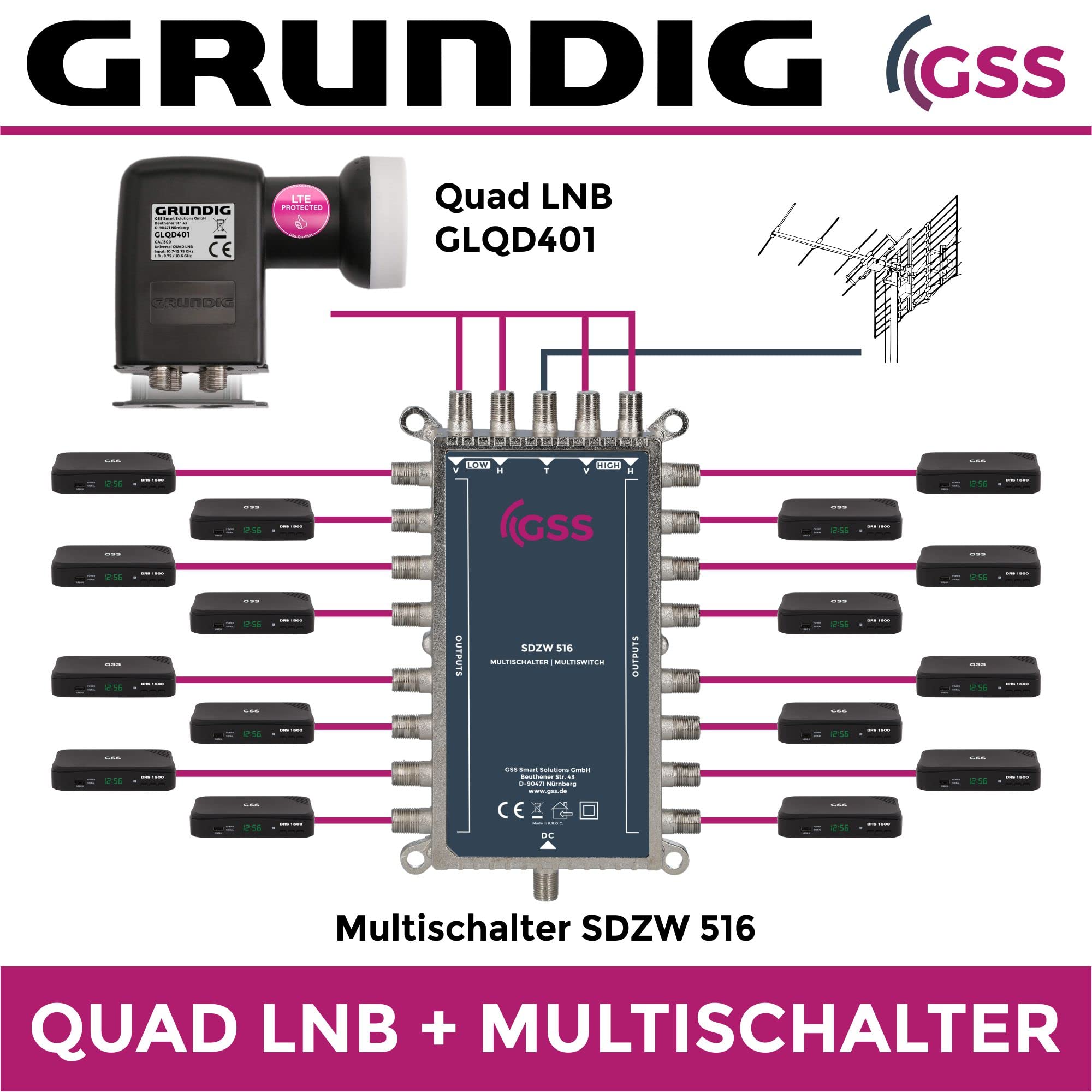 Idéal pour la distribution de votre maison à domicile, dans les immeubles multifamiliaux, les maisons d'hôtes ou les petites installations d'hôtel. Tous les participants connectés peuvent regarder indépendamment l'émetteur que vous souhaitez. Il suffit de le connecter à un LNB universel Quad ou Quattro Commutateur multiple 5/16 avec mode économie d'énergie. Filtre LTE et réception stable Le LNB GSS Grundig Quad assure une excellente propriété de réception avec un niveau de bruit de 0,1 dB et un filtre LTE (contre les interférences du signal). Ce multiswitch PremiumX permet de distribuer le signal à jusqu'à 8 télés ou récepteurs indépendamment. Supporte la 4K, 8K, HD, etc. – donc pas de souci de... STRONG Slimsat SA64 Parabole avec LNB Quad intégrée pour 4 participants, Fixation au mur, balcon Le commutateur multiple GSS fonctionne complètement sans bloc d'alimentation, il suffit de connecter le système satellite et le récepteur via un câble satellite Contenu de la livraison : 1 interrupteur multiple GSS 5/16, 1 LNB Quad GSS Grundig, manuel d'utilisation (français non garanti), boîte de rangement, vis de montage Entièrement compatible - Commutateur multiple 5/16 pour HDTV, 3D, Full HD, 8K, 4K, UHD SAT. Puissance zéro : 0 W en veille. Distribution Signal Satellite Maison GSS Set 9/8 Commutateur Multiple + 2 LNB Grundig Quattro - 8 Participants 2 Satellites - Matrix, Commutateur Multiple Pour Antenne Satellite, TV Numérique HDTV 4K 8K, Chaîne Satellite, Distributeur Kit Switch LNB Quad Grundig GSS Kit commutateur multiple 5/16 LNB Grundig Quad - 16 participants 1 matrice satellite, commutateur multiple pour antenne satellite, TV numérique HDTV 4K 8K, système satellite, récepteur, : : High-TechPuissance zéro GSS Grundig Quad LNB avec protection contre les intempéries Le LNB GSS Grundig Quad noir fourni dans le kit, avec Enregistrement de 40 mm, a une protection contre les intempéries extensible qui protège les ports LNB, par mauvais temps. Pour un montage intérieur uniquement. Protection contre les intempéries Installation facile Grâce aux vis fournies, un montage facile du commutateur multiple est possible. Avec notre commutateur multiple, la réception de la radio Ultra HD, 4K, Full HD, 3D, sans problème. 5 entrées 16 sorties, entrée terrestre (DVB-T/T2/DAB+/UKW)