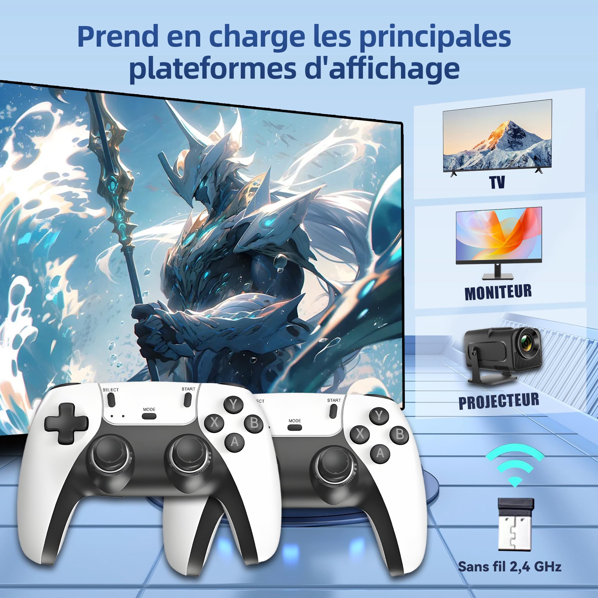 Console TV Manettes Sans Fil X2 Manettes De Jeu Rétro Bleues Avec Deux Manettes Sans Fil Jeux Vidéo PRISE EN CHARGE DE LA SORTIE 4K HD ET COMPATIBILITÉ MULTILINGUE : cette manette de jeu 4K se connecte à votre téléviseur via HD, avec une transition fluide entre 1080P et 722P. 128G 40000 jeux-Console De Jeux Vidéo Hd 4k, 40000 Jeux Rétro Avec... X2 Blue Console de Jeu rétro,plus de 40000 jeux rétro intégrés, plus de 40 émulateurs,plug and play, manette de jeu vidéo avec deux manettes sans fil 2,4 G,TV/ordinateur,console de jeu rétro (128 Go Tous les jeux fonctionnent sans ralentissement, offrant une expérience de jeu classique plus fluide Elle s'adapte dynamiquement pour offrir des images de qualité cinématographique ou des jeux à faible latence, vous permettant ainsi de profiter du plaisir de jouer sur grand écran. TRIXES 2 x Manette de Jeu Rétro Compatible SNES pour Remplacement Les manettes ont une prise en main confortable, ce qui les rend faciles à utiliser pendant de longues périodes sans fatigue Il suffit de connecter l'appareil à votre téléviseur via le port HD, de brancher l'adaptateur secteur et d'allumer l'appareil pour accéder à l'interface principale du jeu. Tableau des paramètres: Couleur : noir bleu Processeur : Amlogic S905L Quad-Core Cortex-A55 jusqu'à 1,8 GHz Mémoire vive : LPDDR3 1 Go Stockage : 64/128/256 Go Nombre de jeux : 30 000+/40 000+/70 000+ Système d'exploitation : Emuelec Sortie TV prise en charge : sortie HD, 1080P, 720P Langues : anglais, russe, espagnol, portugais, coréen, arabe Manettes : deux manettes sans fil 2,4 GHz PROCESSEUR PUISSANT ET JEUX MULTI-PLATEFORMES FLUIDES : cette manette de jeu rétro est équipée d'un processeur quadricœur Amlogic S905L et d'une mémoire de 1 Go, permettant le fonctionnement fluide de plus de 32 émulateurs. Le pack comprend : 1 manette de jeu 2 manettes sans fil 1 câble compatible HD 1 câble d'alimentation USB 1 récepteur USB 1 manuel Qu'il s'agisse de jeux compétitifs ou coopératifs, l'expérience est plus immersive. Cette manette de jeu prend en charge le mode bataille à deux joueurs. Au démarrage, le système détecte et charge automatiquement les nombreux jeux préinstallés, éliminant ainsi le besoin de processus de configuration ou d'installation complexes.