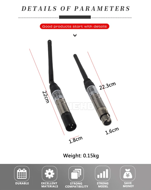 【Boîtier Zn robuste】 : alliage de zinc résistant à la corrosion avec bords arrondis pour une utilisation professionnelle durable. Stagg Récepteur Sans Fil DMX512 Contrôleur et interface dmx EN STOCK : Émetteur DMX sans fil, émetteur-récepteur DMX512 sans fil 2,4 GHz, carte d'apprentissage, contrôleur de lumière LED DMX sans fil, émetteur-récepteur, TYYMH02049 pas cher. Livraison rapide partout en France Sensibilité du récepteur : -94 dBm. La modulation GFSK et la portée de 400 m assurent une transmission fiable du signal pour les systèmes DMX sans fil. Taille de chaque récepteur : 8,5 × 1,5 cm. Puissance d'émission : max., 20 dBm. Solution DMX sans fil pour les professionnels Caractéristiques techniques : Matériau : alliage de zinc., Couleur : noir, argenté. Kit DMX Sans Fil 2.4 GHz Pour éclairage Scénique Kit DMX512 Sans Fil 2.4GHz - 1 Émetteur + 7 Récepteurs | Portée 400m | Pour Éclairage Scène Et Bar éclairage Scène émetteur Récepteur DMX512 2.4GHz Taille de l'emballage: 23,2 × 13,5 × 16 cm / 9,1 × 5,3 × 6,3 pouces Poids net : 0,8 kg., Poids brut : 1 kg. Donner Emetteur Récepteurs DMX sans Fil 2.4G avec Adaptateurs 1... Idéal pour les scènes, les événements et les bars - Permet un contrôle flexible de la lumière avec l'émetteur/récepteur DMX avec technologie d'antenne. LED d'état claires et connecteurs DMX à 3 broches. Source d'alimentation : filaire Prise : norme européenne., Tension : 5 V CC. 1 manuel d'utilisation en anglais., Remarques : 1., Veuillez noter que ce produit ne peut être utilisé que pour les appareils avec un signal DMX512., 2., Veuillez noter que l'émetteur et le récepteur n'ont pas de piles intégrées, les blocs d'alimentation sont donc nécessaires pour fonctionner., 3., Veuillez noter que ce produit n'est pas étanche, il faut donc assurer une bonne étanchéité les jours de pluie., 4., Les mesures étant prises à la main, les tailles indiquées peuvent varier de 1 à 3 cm. Compact (émetteur : 12,5 × 9,5 × 2 cm) et léger (0,8 kg) – Idéal pour les événements mobiles. Parfait pour les spectacles de lumière synchrones avec des commandes DMX précises. Transmission stable de 2,4 GHz : 126 canaux automatiques dans la plage de 2,4 GHz garantissent un fonctionnement sans interférence (pas d'interférence WiFi/Bluetooth). Type de processeur : processeur ARM 32 bits Type de connecteur : interface DMX à 3 broches Type de source lumineuse : LED Plage de fréquence de fonctionnement : 2,4 GHz ISM, 126 canaux.