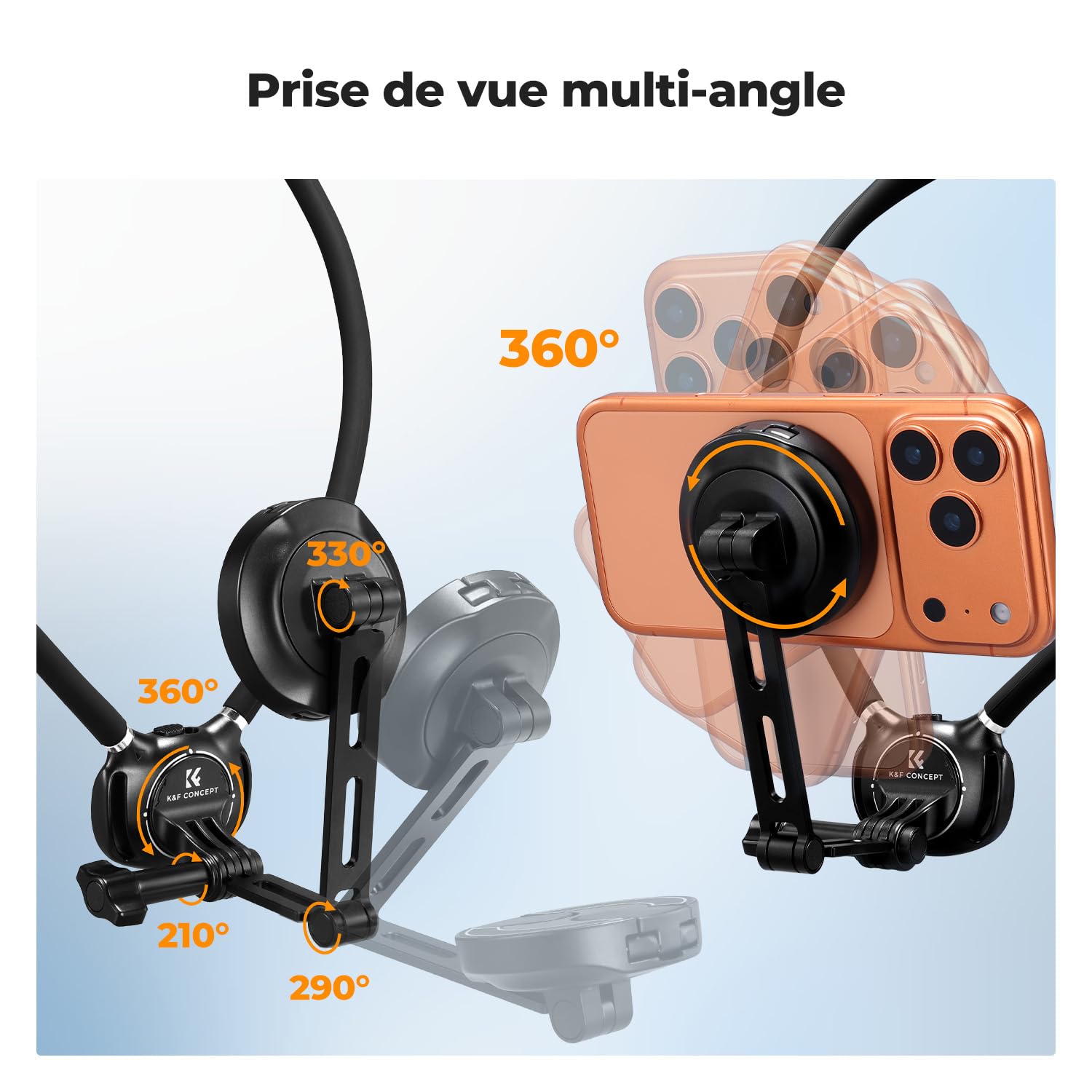 Conception mains libres et vue POV immersive: Accrochez simplement ce support de téléphone 2-en-1 magnétique et clipsable autour de votre cou pour des prises de vue stables et mains libres. K&F CONCEPT 2 en 1 Support pour Cou Téléphone Portable Magnétique Clip, POV/Vlog Porte Telephone Cou Compatible avec Les Téléphones Portables Magsafe iPhone 17 16 15 14 13 12 Series Android : : High-TechÀ propos de cet article Conception mains libres et vue POV immersive Le point de vue naturel à hauteur des yeux facilite la création de vidéos et de blogs immersifs qui vous donnent l'impression d'être sur place Les autres caméras nécessitent un accessoire séparé Coussin d'air et sangle de poitrine réglable pour une stabilité exceptionnelle: Équipé d'un coussin d'air doux autour du cou et d'une sangle de poitrine améliorée de 1,5 m, ce support tour de cou magnétique pour téléphone réduit considérablement les tremblements du téléphone et de la caméra, même lors d'activités intenses comme la course et le saut. Support POV Vlog Mains Libres K&F CONCEPT 2 En 1 Support Pour Cou Téléphone Portable Magnétique Support Cou Téléphone Mécanisme de rotation intégré pour des prises de vue instantanées en portrait et en paysage: Notre support de téléphone est équipé d'une fonction de rotation intégrée innovante (quatre angles réglables). Fixation/Détachement en un seul geste et tube d'articulation long et confortable: Le système de verrouillage en alliage d'aluminium amélioré permet une fixation et un retrait de la caméra en un seul geste. De plus, notre support tour de cou pour téléphone pour tournage est doté d'un tube d'articulation en silicone flexible et résistant de 66 cm de long, qui se plie librement pour un rangement facile. Compatibilité étendue avec presque tous les smartphones: Le support de téléphone POV est compatible avec une large gamme d'appareils, dont 99 % des smartphones. K&F Concept Clip Magnétique Amovible Support Compatible avec Ce support tour de cou pour téléphone se fixe grâce à une articulation à double griffe et une vis en T. Tour de cou Téléphone | Universel Renforcés
