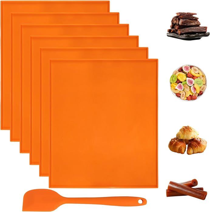 [Bords anti-déversement] Le tapis en silicone déshydrateur a un design à bord surélevé, ce qui peut empêcher efficacement le liquide de se renverser. Matériau en silicone de qualité alimentaire : nos feuilles de déshydrateur en silicone sont fabriquées en silicone de qualité alimentaire de haute qualité, antiadhésif, durable, réutilisable et facile à nettoyer, passent au lave-vaisselle. Avec grattoir en silicone : livré avec un grattoir en silicone supplémentaire qui vous permet de peler facilement les aliments du plateau déshydrateur en silicone, ou de l'utiliser comme grattoir pour remuer les aliments. Tapis de réfrigérateur multifonctions Tapis de réfrigérateur anti [Spécifications du colis] Le paquet contient 4 coussinets en silicone, 1 grattoir en silicone, taille du tampon en silicone : 30,5 x 25,5 x 1 cm, taille du grattoir : 21 x 4 cm Multifonctionnel : les plateaux de déshydratation sont parfaits pour réaliser des rouleaux de fruits, des pâtes de fruits, déshydrater des fruits, des légumes, du jerky, des biscuits et bien plus encore Accessoire Déshydratation Fruits Légumes Herbes 4pcs Tapis De Déshydrateur En Silicone Avec Bord Feuilles De Déshydrateur Antiad Tapis Silicone Pour Déshydrateur Nos plateaux en cuir de fruits sont parfaits pour les rouleaux de fruits, le cuir de fruits, les fruits déshydratés, les légumes, les herbes et les viandes. Également parfaits pour faire des rouleaux suisses, servir de plateau alimentaire ou de napperon