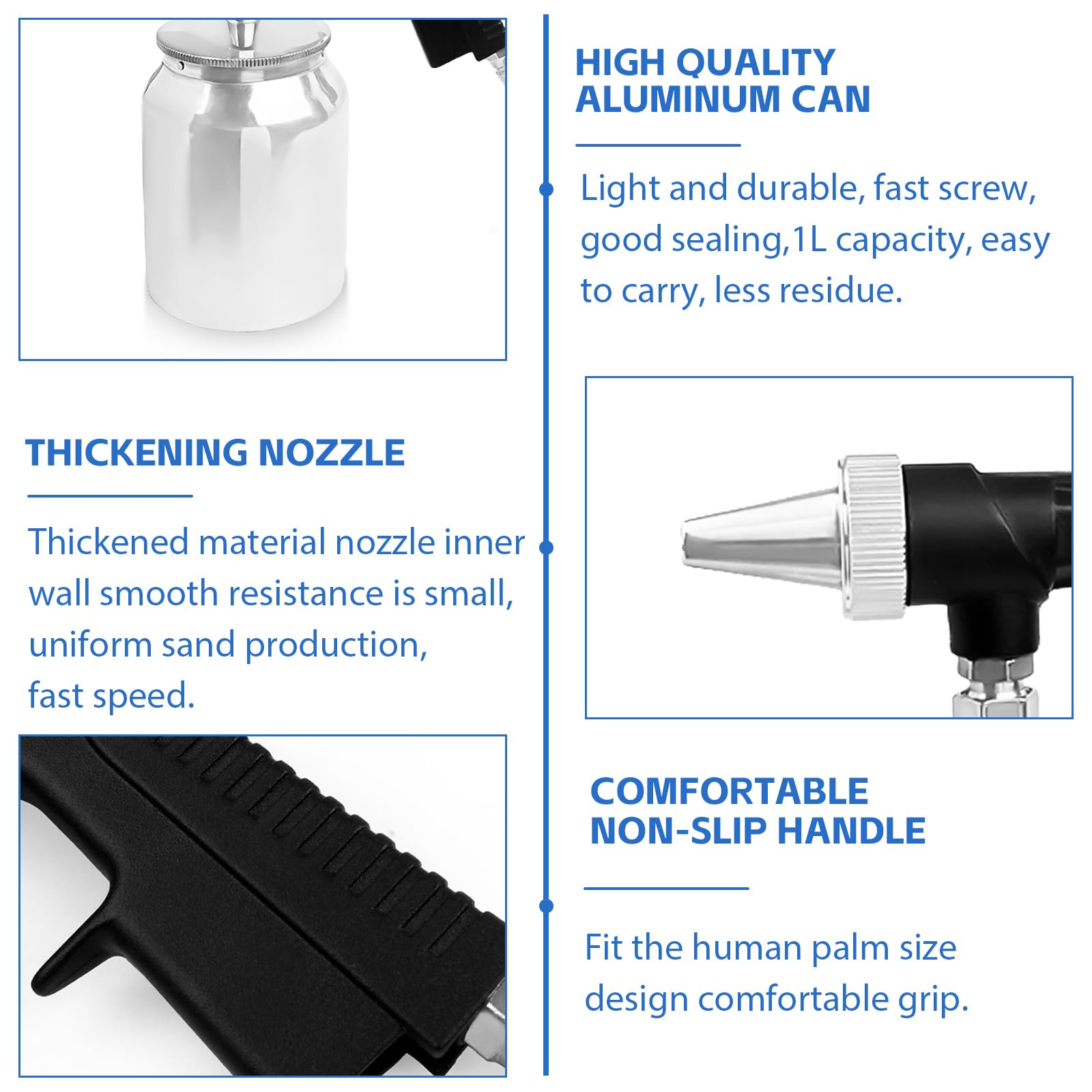 Kompressorzubehör Ausblaspistole Druckluftschlauch Reifenfüller Schlagschrauber Poignée confortable et antidérapante adaptée à la taille de la paume humaine et offrant une prise en main confortable. Sableuse de taille compacte, très pratique à ranger et à transporter, convient pour une utilisation en intérieur et en extérieur. Pression d'air : 6,5 à 8 kg. Caractéristiques : Matériau : corps du pistolet (alliage d'aluminium) pot (alliage d'aluminium) buse (acier n° 45) Capacité du pot : 1000 ml. Couleur 23,5 mm 4 pièces Appareil de Sablage pour Pneu, Sableuse Portable, Tête de Buse, Embout... Pistolet de sablage avec buse de 6 mm, sableuse avec réservoir de sable de 1 l, sableuse pour compresseur, sablage pneumatique pour givrage du verre, élimination de la rouille, pièces mécaniques accessoires de compresseur Ce pistolet de sablage est adapté pour le polissage du métal, l'élimination de la rouille et le traitement des détails. Pulvérisation fine : le pistolet pulvérisateur peut être appliqué sur des matériaux à base d'huile, de solvants et d'eau, et le pistolet pulvérisateur permet de pulvériser différents revêtements et textures. La sableuse peut être largement utilisée pour le meulage, le sablage, le polissage des surfaces, le dérouillage, la peinture, etc., Très pratique. La paroi intérieure de la buse en matériau épais est lisse et présente une faible résistance, et le sable est évacué uniformément et rapidement. Les sableuses professionnelles sont idéales pour les travaux professionnels et précis. Structure compacte, que ce soit à l'intérieur ou à l'extérieur, la sableuse est très pratique à ranger et à transporter. Dimensions : 195 x 110 x 230 mm., Poids du produit :0., 75 kilogrammes Contenu : 1 sableuse., 1 buse. En cas d'erreur, veuillez vous référer au produit réel reçu. Le réservoir à sable a une grande capacité de 1L, ce qui est facile à transporter et laisse peu de résidus. Nettoyage efficace : le pistolet de sablage peut pulvériser du sable ou des matériaux granuleux à grande vitesse sur la surface de l'objet à traiter, accélérant ainsi le nettoyage ou le traitement de surface. La pression de travail ne doit pas dépasser 8 bar et la consommation d'air est de 7,0 cfm. Tous les paramètres sont mesurés à la main. L'effet de sablage peut être contrôlé avec précision en fonction de la situation et la sableuse est adaptée aux besoins de traitement de différents matériaux et surfaces. Le pistolet de sablage dispose d'un boîtier en alliage d'aluminium moulé avec une poignée antidérapante pour une utilisation simplifiée. Aerogommage Bois Pour Compresseur Avec Buse De 6Mm, Sableuse Avec Réservoir De Sable De 1L Pistolet De Sablage Sableuse professionnelle : pistolet à sable avec buse de 6 mm. Facilite le nettoyage des petits coins morts. Ce pistolet de sablage est adapté pour le polissage du métal, l'élimination de la rouille et le traitement des détails. Facilite le nettoyage des petits coins morts Avec cette buse, vous pouvez utiliser du sable avec une taille de particules de 80 à 100 mailles.