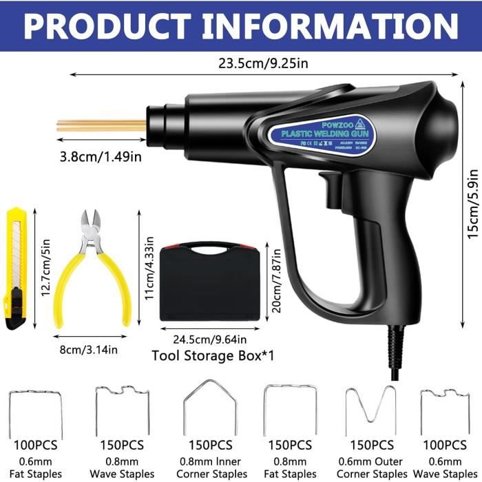 Le KIMIGO 200W Soudure Plastique est l'outil idéal pour la réparation de pièces en plastique fissurées et endommagées, notamment les pare-chocs de voiture, les accessoires en plastique, les bateaux, les motos, et bien plus encore le clip de clou de soudage à double tube est en cuivre pur,plus durable,plus sûr et ne génère pas de chaleur. Agrafe Carrosserie KIMIGO 200W Soudure Plastique, Kit De Réparation Pare-Chocs Soudeur Plastique Équipement pour Soudage Fer a Souder Plastique Soudeur Plastique Pistolet Soudure Plastique Kit Reparation pare Choc 2 en 1 Soudage Machine Kit Réparation Souder Plastique 900 PCS 6 TYPES DE CLIPS - Les chevilles en acier inoxydable de haute qualité ne rouillent pas. LARGE GAMME D'APPLICATIONS - La machine de soudage en plastique peut réparer la plupart des pièces en plastique fissurées et endommagées,y compris les pare-chocs de voiture,les plaques d'accessoires,les anneaux en plastique,les refroidisseurs,les ailes,les phares,les bateaux,les motos et les unités en plastique de voiture,les poubelles,les accessoires en plastique quotidiens,etc Il convient pour réparer et renforcer les pièces en plastique de toutes les automobiles, telles que les pare-chocs, les tableaux de bord, les supports de lampe, ainsi que d'autres fournitures en plastique du quotidien 200W Soudure Plastique, Soudeuse Avec 200Pcs 4 Types Agrafes Sans Fil Kit De Reparation De Pare Chocs De Voiture Facturable Soudeur Plastique Pour Reparer Un Automoto Pare Chocs Ou Plastiqu 90242426 MACHINE DE SOUDAGE MISE À JOUR - Avec moteur 200w intégré,chauffage plus rapide et gain de temps. conception de lampe à led frontale,facile à utiliser même dans des environnements sombres (s'il vous plaît ne pas utiliser trop de pression lorsque le plastique fond pour empêcher l'appareil de traverser le film plastique.