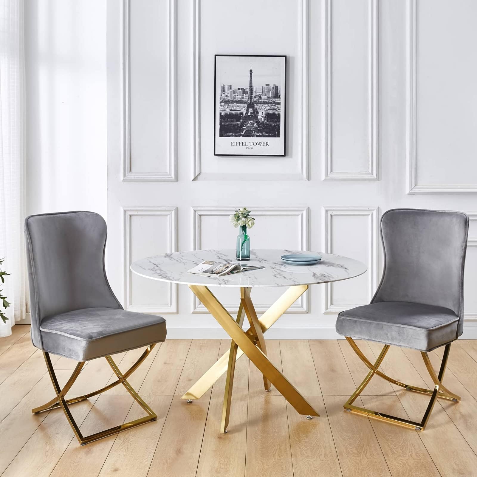 Son design et sa taille uniques, associés à sa fonctionnalité et à son design, rendent cette table à manger élégante et parfaite pour toutes les pièces de la maison. Le plateau de table en MDF présente un motif de pierre réaliste, assemblé en deux pièces, offrant la sensation et l'apparence de la pierre naturelle. Ce design apporte une touche de beauté naturelle à votre salle à manger tout en conservant un aspect cohérent Cette table ronde aux angles arrondis vous protège efficacement, vous et votre famille. Ses quatre pieds métalliques robustes et résistants à la rouille offrent une excellente stabilité. Nous fournissons également les instructions et les outils nécessaires pour un montage optimal. Table Appartement Grise 115 CM Table De Cuisine Ronde Moderne De MDF, Motif Pierre Bois Pied Central Extensible Son plateau lisse et soigné est imperméable et facile à nettoyer. Notre table à manger moderne est dotée de quatre patins antidérapants sous ses pieds pour une meilleure stabilité et éviter les bruits et les traces de doigts lors de ses déplacements. INSTALLATION ET NETTOYAGE FACILES : Nous fournissons des kits faciles à monter pour une installation personnalisée. Fabriqué en MDF, il offre une forte capacité de charge. Table ronde en mdf et acier dipp 115 cm Son épaisseur de 1,8 cm permet de supporter environ 80 kg. Table de salle à manger blanche extensible 120-160×80cm, pieds croisés...