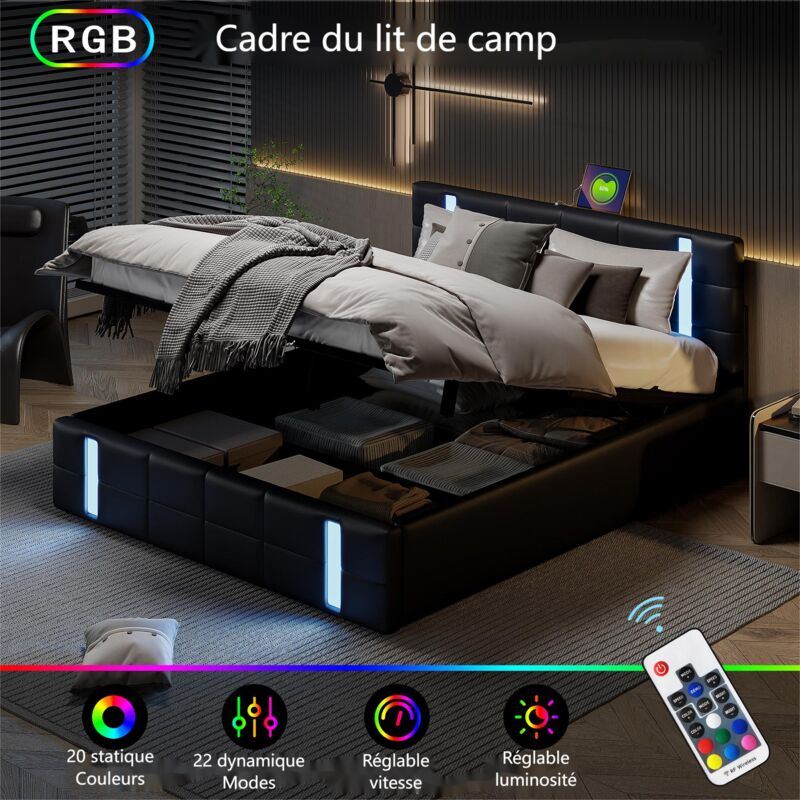 Le sommier à lattes se replie facilement en soulevant les bandes de tissu. Ce lit double offrira divers espaces de rangement en gain de place. Les étagères ouvertes s'associent au rangement caché sur la tête du lit, parfait pour ranger vos livres, portables et iPad en charge, facilitant vos chargements avec la multiprise. Si vous ne recevez qu’un seul colis, vous pouvez nous contacter pour suivre l'acheminement du deuxième colis avant d'assembler ce lit 160 x 200 avec sommier et rangement 【Multiprise Intégrée】 Doté d'une multiprise avec USB-A et un port USB-C sur la tête de lit, ce lit double 160x200 vous permet de brancher simultanément vos téléphones, réveils et autres appareils électroniques avant de vous coucher. Tête De Lit 140 Lit Coffre Double 160 X 200 Avec Sommier,lit Avec Tiroir,dossier Moelleux, Tête De Lit Avec Rangement Et Port USB,LED,velours,blanc - Maison Lit Chambre Gain De Place Lit LED avec Multiprise Ce lit est équipé d’un ruban LED, réglable en couleur, luminosité, mode d'éclairage et fonction de minuterie via la télécommande ou l’APP. Profitez pleinement de vos moments de détente au lit coffre 160x200 ! l'éclairage LED à la tête et au pied du lit ajoute un style moderne à votre chambre, et avec la télécommande, vous pouvez changer les différentes couleurs et la luminosité pour un sommeil confortable. Ce lit 160x200 avec sommier sera idéal pour les petites chambres et appartements, optimisant l'espace et faisant de votre chambre bien propre et organisée Parfait pour stocker linge de lit, vêtements saisonniers ou objets volumineux, tout en gardant votre chambre bien rangée. ports usb et type-c intégrés et certifiés ce rechargez facilement vos appareils électroniques directement depuis le lit Description du produit Lit Coffre à LED Lit 2 Places avec Rangement Spacieux Grâce au support du vérin à gaz, l'espace sous les lattes de lit peut être utilisé pour stocker de grands objets. Lit 140x200 avec Sommier LED et USB La sangle de tirage vous permet de soulever facilement le cadre de lit pour un rangement pratique 2 stabilisateurs de matelas, empêchant le matelas de glisser Sommier à latte de bois élastique, plus confortable et silencieuse L'espace sous lit avec le tour de lit rélargi vous permet de garder vos valises, couvertures, boîtes de rangement et autres articles peu utilisé à l'abri des regards et de la poussière Lit Multifonctionnel LED avec USB Rechargeable, 180*200cm, Éclairage LED et Tête de Lit Réglable en PU Étanche, Lit Hydraulique avec Rangement Vendu par DarmlinkShop LIVLUX Lit Coffre 160x200 cm,lit capitonné avec Ports de Un tissu non tissé est fixé au bas du lit qui empêche la poussière.