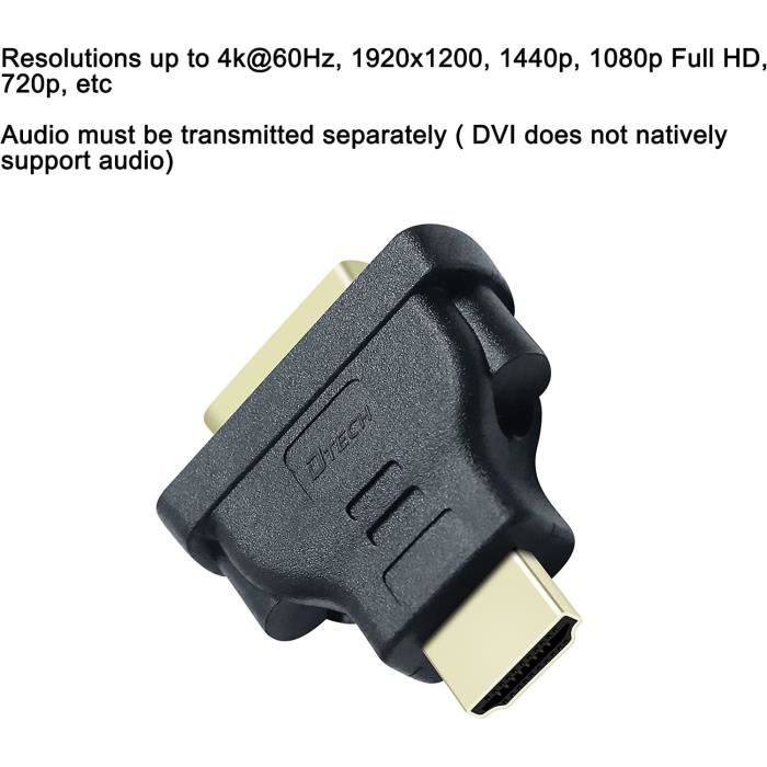 Adaptateur câble HDMI 19 broches de type A mâle vers DVI-D 24 1 broches mâle de 1.5M Noir convertisseur pour lecteurs. En 1 fois. 11,49 €. 11 €49. En 4 fois Ses dimensions compactes (4,1 cm x 1,5 cm) en font un accessoire pratique et portable. Câble Adaptateur Vidéo Numérique Avizar Convertisseur Vidéo HDMI Femelle Vers DVI Mâle Bidirectionnel Connecteur 19 Broches Plug Play Découvrez notre adaptateur DVI-D vers HDMI, la solution parfaite pour connecter vos appareils numériques. La construction solide en plastique noir protège efficacement les composants internes tout en assurant une connexion fiable. QUALITÉ DE TRANSMISSION: Interface dorée à 19 broches assurant une connexion stable et une transmission de signal fiable Câble convertisseur HDMI 19 broches de type A mâle vers DVI-D 24 1 broches mâle 1.5M Noir pour lecteurs UHD-Visiodirect- - Reconditionné - Visiodirect Adaptateur bidirectionnel Vention ECCB0 HDMI mâle - DVI (24+5) femelle Doté d'un connecteur DVI-D mâle d'un côté et d'une sortie HDMI femelle de l'autre, cet adaptateur noir robuste assure une transmission stable du signal numérique. La finition en or des connecteurs garantit une excellente conductivité et une durabilité optimale. Ce convertisseur bidirectionnel compact de 5 cm de longueur permet une connexion fluide entre vos équipements DVI et HDMI.