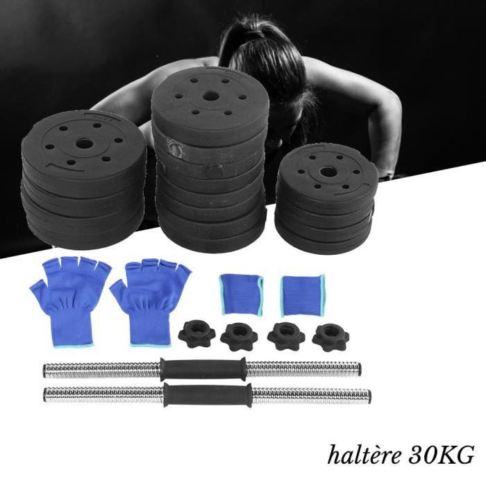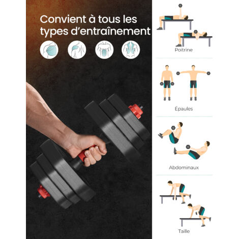 Dimensions de l’haltère courte : 52,7 x 21,8 x 19,6 cm (L x l x H) , Poids total : 30 kg Il vous permet de personnaliser votre séance : Les différents disques vous donnent la possibilité d’ajuster facilement les poids selon l’intensité souhaitée, en les combinant à votre guise. Transformez votre jeu d’haltères courts en barre longue : Grâce à la barre de connexion spéciale incluse, vous obtenez une barre longue en un clin d’œil. Matériaux de qualité : Remplis de béton et de sable et protégés par une coque en plastique robuste et sans odeur, ces haltères offrent un entraînement silencieux et durable Sécurité : Les doubles colliers de serrage maintiennent les disques bien en place et évitent tout desserrage. Barre Dhaltère SONGMICS Set D'Haltères, Haltères Avec Barre De Connexion, Hexagonales, 10 Kg, Pour L'Entraînement, La Musculation, L'Haltérophilie à Domicile Ou En Salle De Sport, Noir D'Encre SYL100B01 Barre Alteres Musculation 4 x Jeu de colliers de serrage , 1 x Barre longue La forme hexagonale empêche tout roulement, facilite le rangement et protège le sol Caractéristiques : Couleur : Noir d'encre Passage rapide entre haltères courts et barre longue 2 Haltères 15 kg jaune pratique Notre jeu d’haltères est conçu pour vous offrir des séances d’entraînement optimales, sans contrainte de temps ni d’espace. Matériaux : Barre en acier, coque de protection en plastique, remplissage en béton et sable Précautions de SONGMICS : Pour votre sécurité, ne rangez pas les haltères en hauteur, afin d’éviter tout risque de chute. Vous élargissez ainsi vos possibilités d’exercices, ciblez davantage de groupes musculaires et optimisez chaque séance pour des résultats visibles. SONGMICS Lot de 2 Haltères, 2 x 1 kg, Haltères Hexagonaux avec Surface en Vinyle, pour Fitness, Exercice, Entraînement, pour Salle de Sport, Domicile, Jaune SYL62YL Kit haltères Musculation, avec Barre d'Extension, Poids Ajustable,pour Hommes et Femmes, Musculation, Prise de Masse à la Maison, 1 Paire par SONGMICS Livraison : 8 x Disque de 2,5 kg