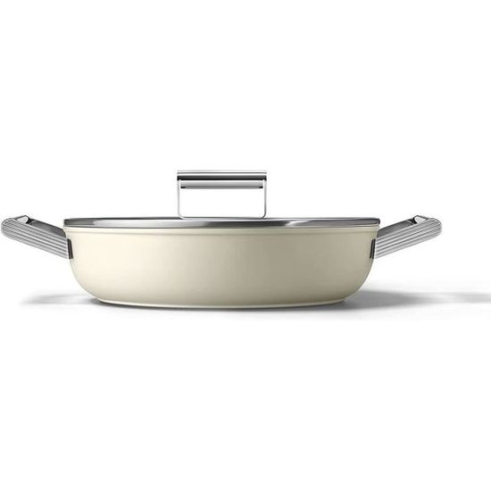 【Compatible Tous Feux】 Convient aux plaques à gaz, électriques et à induction. Cette poêle profonde convient à tous les types de cuisinières, mais elle est spécialement conçue pour l'induction. Elle est dotée de poignées en acier inoxydable. Les poignées sont rivetées pour éviter la surchauffe. La poêle est en aluminium. Finition cuivrée Description du produit : Découvrez notre nouveau wok à paroi large de 28 cm, fabriqué en fonte pure de haute qualité pour une cuisine saine et naturelle. Sa structure robuste la rend également adaptée au four. 【Facile à Nettoyer et de Plus en Plus Performante】 Il suffit de rincer et sécher après usage. Livrée avec couvercle en fer assorti pour cuissons lentes et spatule/louche coordonnée pour remuer et servir facilement. Caractéristiques : Diamètre : 28 cm Matériau : Fonte pure de haute qualité (sans revêtement chimique) Design : Large paroi, fond épais pour une cuisson uniforme et revêtement antiadhésif naturel Accessoires inclus : Couvercle en verre + louche/support Poids : 2 300 g Dimensions du colis : 31,6 x 16,6 x 31 cm Compatibilité : Gaz, électrique, induction, four Entretien : Lavage à la main facile ; S'améliore à l'usage Contenu du coffret : Wok Big Belly de 28 cm *1 Couvercle en verre *1 Spatule *1 Poêle à frire Geneva 28 cm Greenpan - Ambiance & Styles 【Performances de Cuisson Supérieures】 Les parois épaisses et le fond massif assurent une distribution uniforme de la chaleur et une rétention durable, maintenant la température même après avoir éteint le feu. Il est livré avec un couvercle en verre transparent pour surveiller la cuisson et une louche/sautière assortie pour remuer et servir facilement. Le design à “gros ventre” transforme cette sauteuse en outil polyvalent pour frire, mijoter et cuire lentement, offrant une expérience culinaire authentique. Aluminium Forgé : Poêl à frir d haut qualité avc 28 cm, n aluminium forgé. Son épaissur d 3 mm confèr au produit un plus grand durté, un résistanc à l'usag t un distribution fficac d la chalur Wok Fonte Couvercle Verre Spatule Smeg CKFD2811CRM Poêle à Frire Profonde 28 Cm Avec Couvercle Crème, Antiadhésif, Alm, Base Poids 2300g Avec une utilisation régulière, elle développe une surface antiadhésive naturelle, sublimant les saveurs authentiques de vos ingrédients et réduisant le besoin d’huile.