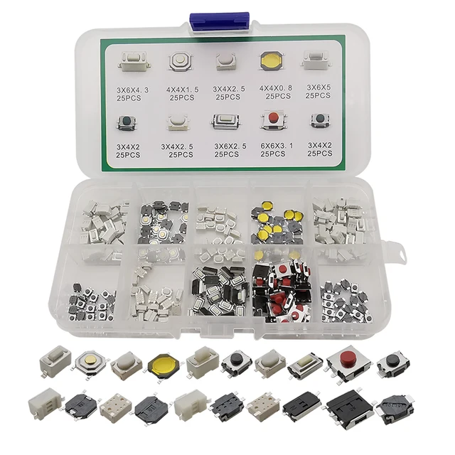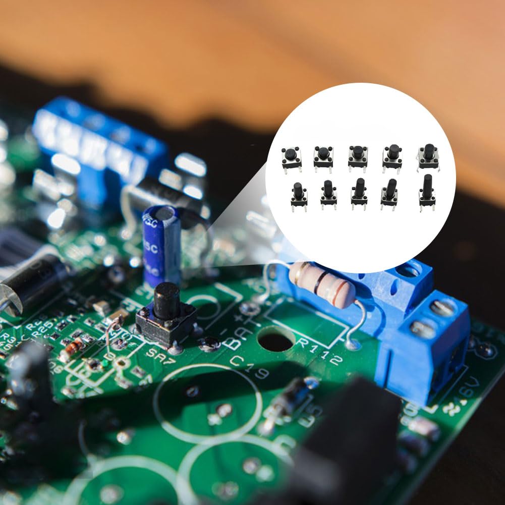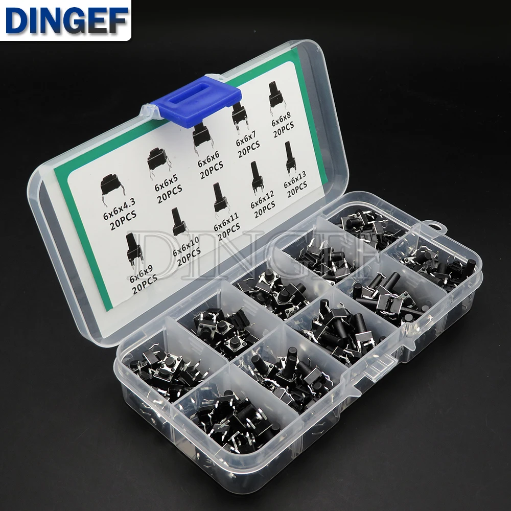 Variété de types de contact : le lot comprend 10 différents types d'interrupteurs tactiles, soit un total de 200 pièces. Les tailles vont de 6 mm à 13 mm, vous permettant de choisir selon vos besoins spécifiques Les boutons robustes à 4 broches sont parfaits pour une utilisation dans les appareils électroniques, les télécommandes, les consoles de jeux et d'autres applications électroniques. Micro Interrupteurs 6x6mm EIF Interrupteurs À Bouton-Poussoir Tactiles Commutateurs Tactiles À Bouton-Poussoir, Micro Kit électronique DIY 200 Pièces Cette vaste gamme de boutons poussoirs tactiles est idéale pour les projets électroniques de bricolage et les réparations de circuits imprimés. Taille universelle : surface de base de 6 x 6 mm pour tous les interrupteurs, différentes hauteurs de 4,3 mm à 13 mm pour de nombreux projets électroniques Rangement pratique : boîte de rangement robuste avec compartiments étiquetés permettant un accès rapide et un rangement clair Taille du bouton : 6 x 6 x 4,3 mm / 5 mm / 6 mm / 7 mm / 8 mm / 9 mm / 10 mm / 11 mm / 12 mm / 13 mm Contact momentané, 4 broches, bouton rond noir, montage à travers le trou, utilisé dans les domaines des produits électroniques, des appareils électroménagers et plus encore 21 pièces 3 bouchons de couleur Micro interrupteurs tactiles en plastique, 20 pièces-lot, 6x6mm Chaque variante est représentée par 20 pièces, ce qui offre suffisamment de matériaux pour différents projets. La boîte de rangement claire protège les composants et les garde bien rangés. Le kit contient 200 micro-interrupteurs de qualité supérieure en 10 tailles différentes, de 4,3 mm à 13 mm de hauteur, tous avec une surface de base uniforme de 6 x 6 mm.