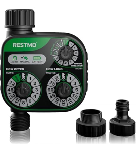 Avec le mode temporisation de pluie, vous pouvez choisir entre 24/48/72 heures. Il offre un fonctionnement flexible et un contrôle précis. 【Minuteur d'arrosage multifonction】: il dispose de 3 modes, automatique/manuel/retard de pluie. Fonctionne avec une pression d'eau de 8 à 120 psi. Ensuite, votre système d'irrigation deviendra automatique et fonctionnera selon le programme. Restmo Minuteur D'arrosage Avec Entrée Et Sortie En Laiton, 3 Appuyez longuement sur le bouton manuel pour arroser manuellement et l'arrosage manuel n'interrompra pas les programmes prédéfinis. Conçu pour une utilisation en extérieur : conçu avec une protection étanche IP55 et une construction étanche. Gérer l'arrosage de votre jardin peut être un véritable casse-tête, surtout lorsque vous jonglez avec un emploi du temps chargé. Le minuteur d'arrosage RESTMO, équipé d'une télécommande RF et de matériaux robustes en laiton, se présente comme la solution idéale RESTMO Lot de 2 minuteurs d'arrosage à 2 zones, minuterie d'arrosage pour tuyau d'arrosage, minuterie de tuyau programmable avec retardateur automatique/pluie/arrosage manuel, minuterie d'irrigation numérique pour robinet extérieur, cour et pelouse Avec le mode manuel, vous pouvez arroser vos fleurs et plantes de 1 min à 299 minutes. 【Imperméabilité et durabilité améliorées】 : conçu pour une confiance absolue contre les fuites, l'écran intégré sans couture de notre minuterie élimine l'entrée d'eau, tandis que le panneau texturé robuste résiste à l'usure. Système d'arrosage automatique avec minuterie ... – Grandado Tournez le cadran pour régler l'horloge, l'heure de démarrage, la durée et la fréquence. Ces caractéristiques offrent une flexibilité ultime pour répondre aux besoins de votre jardin, pluie ou soleil. 3 systèmes de programmation séparés avec paramètres personnalisables : équipé de trois unités programmables complètement séparées, chaque groupe peut définir indépendamment l'heure de démarrage, la durée et la fréquence d'arrosage. Ce minuteur est parfait pour diverses applications d'arrosage en plein air, y compris l'irrigation de tuyau d'arrosage, les arroseurs de pelouse, la brumisation de serre, le remplissage de piscine, les bains d'oiseaux, les barils de pluie et même les distributeurs d'eau pour animaux de compagnie.