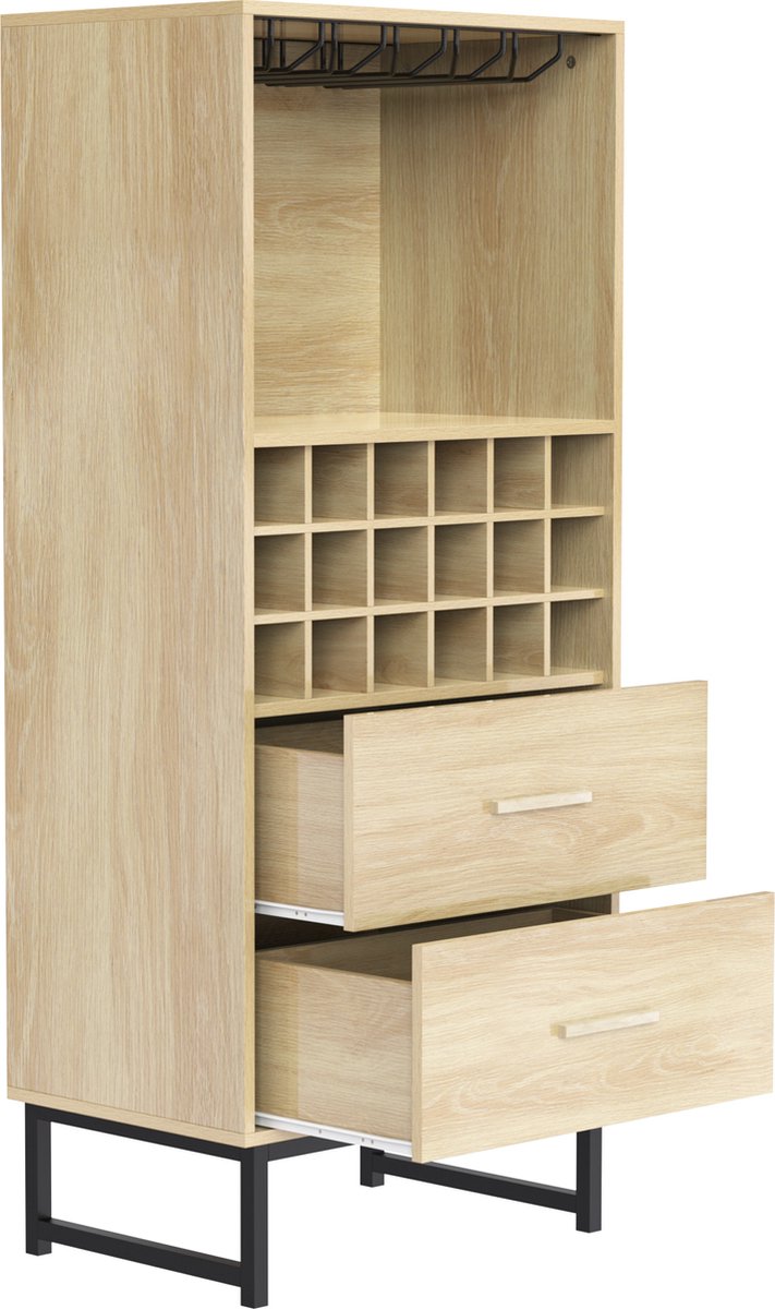 Porte-verres intégré Grâce à son support suspendu, vos verres à vin sont toujours à portée de main et joliment exposés, ajoutant une touche raffinée à votre espace de dégustation. Ce meuble dispose de 18 compartiments ouverts permettant de stocker vos bouteilles de vin en toute sécurité et de les avoir facilement à portée de main. Offrez-vous un meuble à vin raffiné et fonctionnel, idéal pour organiser et exposer votre collection de bouteilles. Ce meuble, mesurant 60 x 39,5 x 141 cm, allie design contemporain et praticité, parfait pour les amateurs de vin et de décoration intérieure Buffet élégant conçu pour les amateurs de vin, alliant fonctionnalité et esthétique moderne. Avec un aspect bois et des pieds en métal noir mat, ce meuble bar à vin offre un design épuré et une construction robuste, idéale pour un intérieur contemporain Rangement polyvalent et organisé Ce meuble dispose de 18 compartiments à bouteilles, d’une grande surface de présentation et de deux tiroirs spacieux, parfaits pour ranger vos accessoires, tire-bouchons et nappes. Étagère À Vin Sur Table, Étagėre De Rangement 6 Niveaux Avec Tiroir, Étagėre De Bar Pour 16 Structure robuste et stable Les pieds métalliques noirs assurent une excellente stabilité, tout en apportant une touche moderne et industrielle à votre espace de vie. Livraison en Plusieurs Colis : En raison des grandes dimensions du lit, celui-ci sera livré en 2 colis séparés. Meuble Avec Porte-verres Intégré Buffet Cave à Vin, 2 Tiroirs 18 Compartiments, Porte-verres, Pieds Métal Noir Mat Meuble élégant Dégustation Vin Que vous soyez un collectionneur de vins ou un amateur de dégustation, ce meuble est la solution idéale pour allier rangement organisé et décoration sophistiquée. Découvrez ce meuble à vin élégant et fonctionnel, conçu pour apporter une touche sophistiquée à votre intérieur. Avec ses dimensions de 60 x 39,5 x 141 cm, il est idéal pour le salon, la salle à manger ou un coin bar.